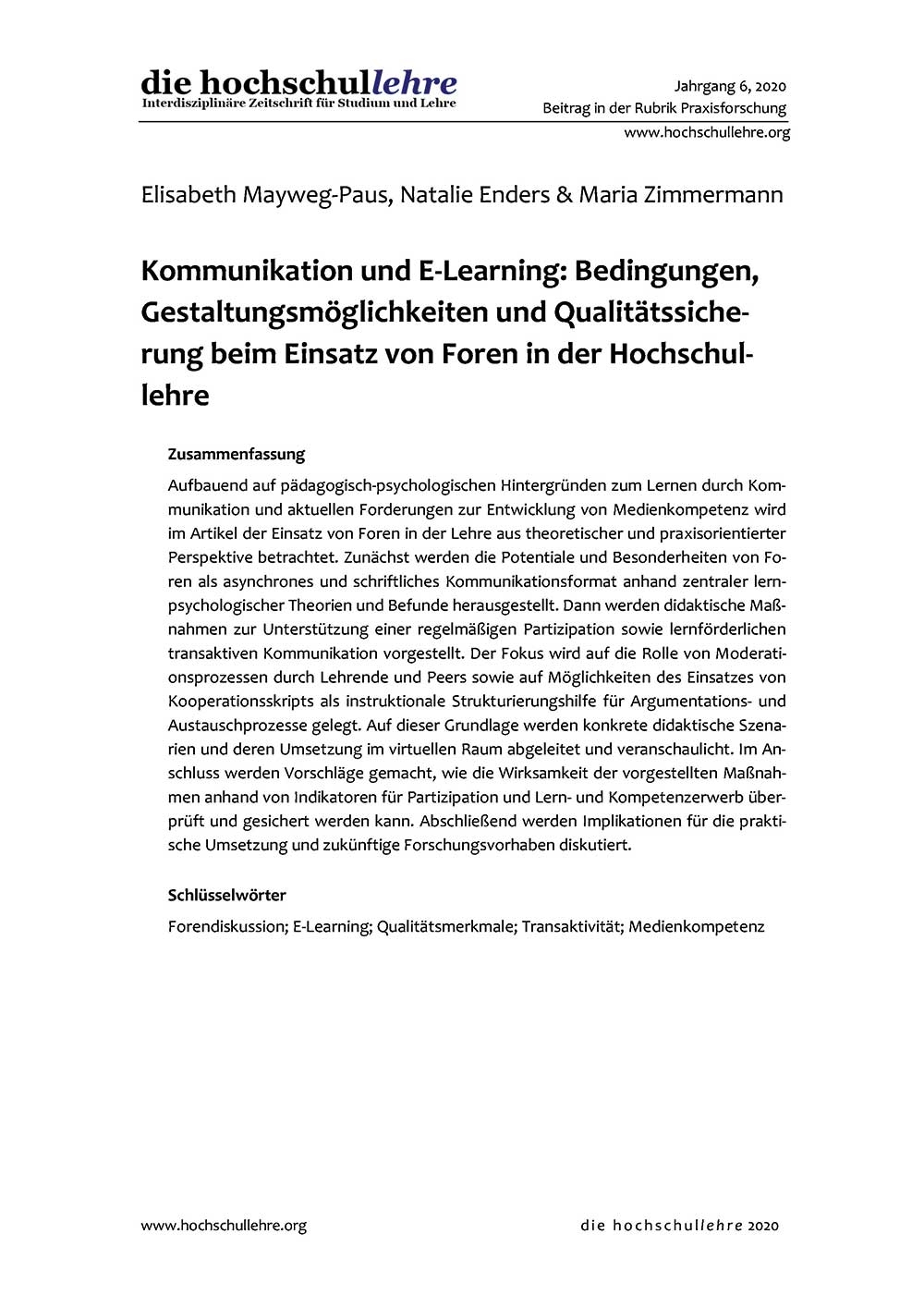 Mayweg-Paus, E., Enders, N. & Zimmermann, M. (2020). Kommunikation und E-Learning: Bedingungen, Gestaltungsmöglichkeiten und Qualitätssicherung beim Einsatz von Foren in der Hochschullehre. die hochschullehre, Jahrgang 6/2020.