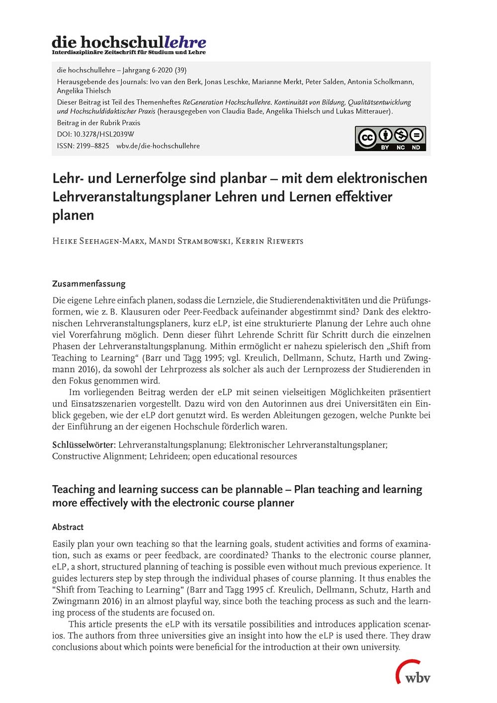 Seehagen-Marx, H., Strambowski, M. & Riewerts, K. (2020). Lehr- und Lernerfolge sind planbar - mit dem elektronischen Lehrveranstaltungsplaner Lehren und Lernen effektiver planen. die hochschullehre, Jahrgang 6/2020. DOI: 10.3278/HSL2039W.