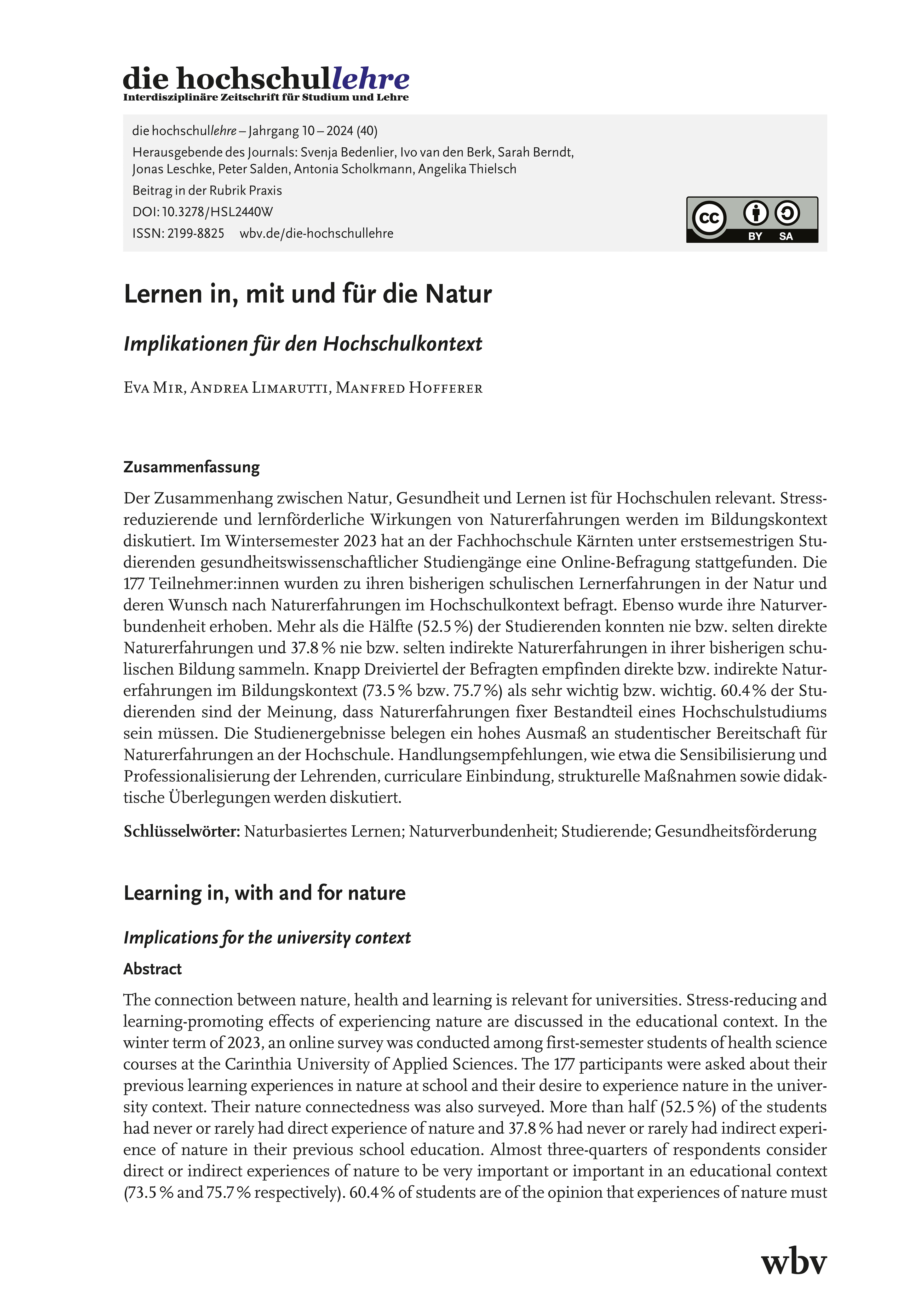 Mir, E., Limarutti, A. & Hofferer, M. (2024). Lernen in, mit und für die Natur. Implikationen für den Hochschulkontext. die hochschullehre, Jahrgang 10/2024. DOI: 10.3278/HSL2440W.