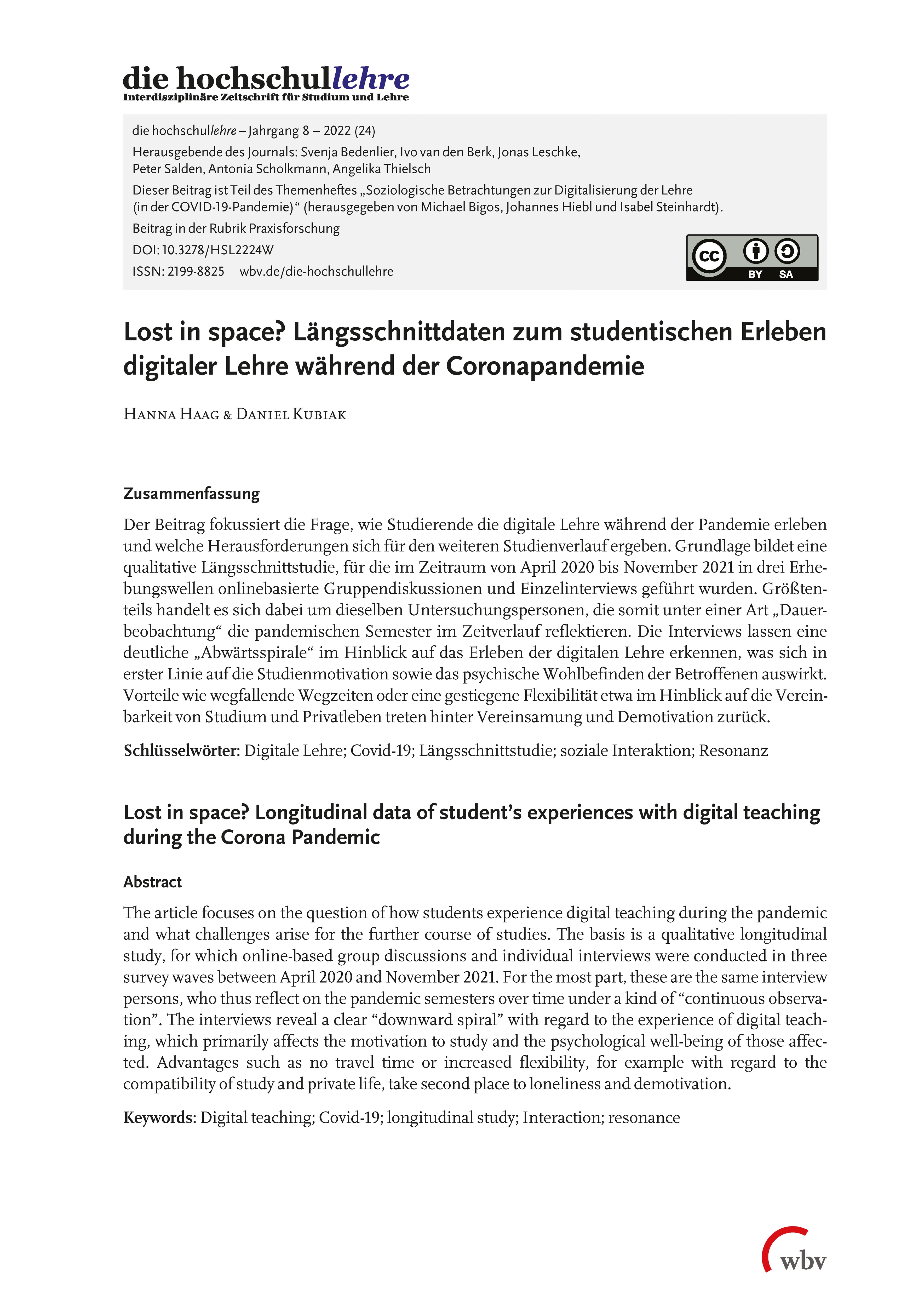Haag, H. & Kubiak, D. (2022). Lost in space? Längsschnittdaten zum studentischen Erleben digitaler Lehre während der Corona-Pandemie. die hochschullehre, Jahrgang 8/2022. DOI: 10.3278/HSL2224W. Online unter: wbv.de/die-hochschullehre