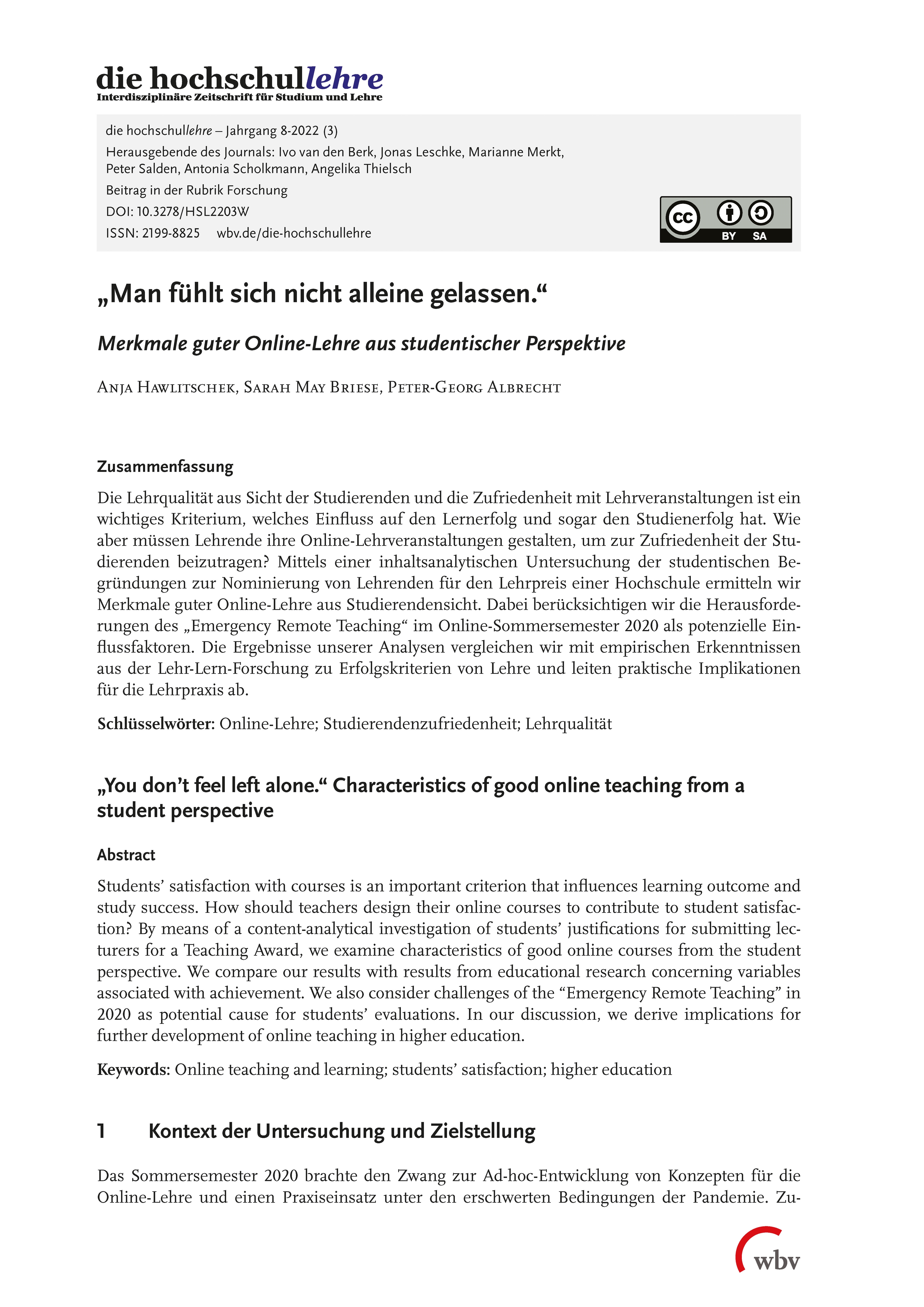 Hawlitschek, A., May Briese, S. & Albrecht, P.-G. (2022). „Man fühlt sich nicht alleine gelassen." Merkmale guter Online-Lehre aus studentischer Perspektive. die hochschullehre, Jahrgang 8/2022. Bielefeld: wbv Publikation. DOI: 10.3278/HSL2203W.