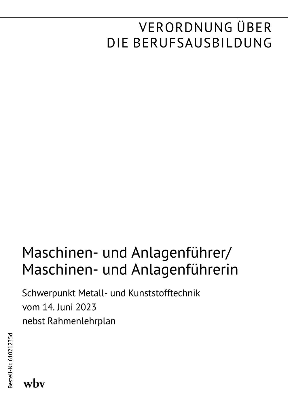 Verordnung über die Berufsausbildung zum Maschinen- und Anlagenführer/zur Maschinen- und Anlagenführerin vom 27. April 2004 (BGBl. I S. 647 vom 30. April 2004), zuletzt geändert durch Artikel 2 der Verordnung zur Neuordnung der Berufsausbildung zum Verfahrensmechaniker für Kunststoff- und Kautschuktechnik und zur Verfahrensmechanikerin für Kunststoff- und Kautschuktechnik vom 14. Juni 2023 (BGBl. 2023 I Nr. 151, S. 45 vom19. Juni 2023) nebst Rahmenlehrplan (Beschluss der Kultusministerkonferenz vom 25. März 2004 in der Fassung vom 31. März 2023)