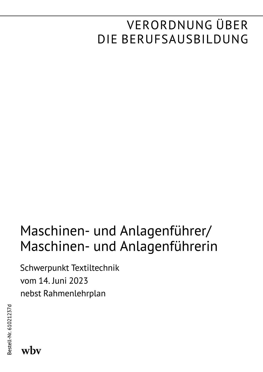 Verordnung über die Berufsausbildung zum Maschinen- und Anlagenführer/zur Maschinen- und Anlagenführerin vom 27. April 2004 (BGBl. I S. 647 vom 30. April 2004), zuletzt geändert durch Artikel 2 der Verordnung zur Neuordnung der Berufsausbildung zum Verfahrensmechaniker für Kunststoff- und Kautschuktechnik und zur Verfahrensmechanikerin für Kunststoff- und Kautschuktechnik vom 14. Juni 2023 (BGBl. 2023 I Nr. 151, S. 45 vom19. Juni 2023) nebst Rahmenlehrplan (Beschluss der Kultusministerkonferenz vom 25. März 2004 in der Fassung vom 31. März 2023).