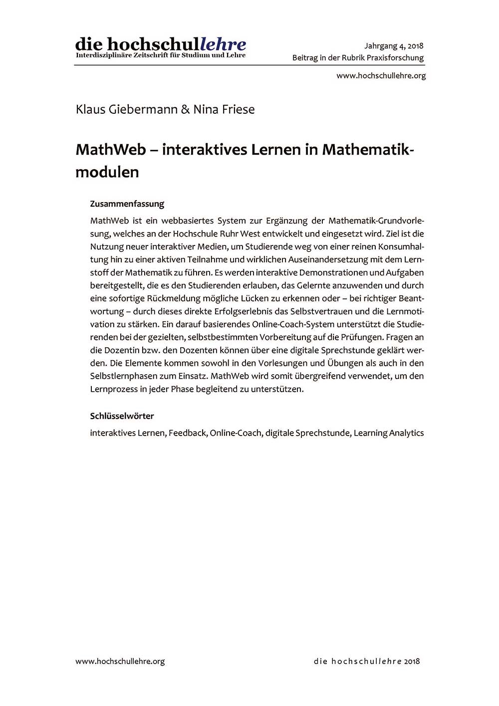 MathWeb ist ein webbasiertes System zur Ergänzung der Mathematik-Grundvorlesung, welches an der Hochschule Ruhr West entwickelt und eingesetzt wird. Ziel ist die Nutzung neuer interaktiver Medien, um Studierende weg von einer reinen Konsumhaltung hin zu einer aktiven Teilnahme und wirklichen Auseinandersetzung mit dem Lernstoff der Mathematik zu führen. Es werden interaktive Demonstrationen und Aufgaben bereitgestellt, die es den Studierenden erlauben, das Gelernte anzuwenden und durch eine sofortige Rückmeldung mögliche Lücken zu erkennen oder - bei richtiger Beantwortung - durch dieses direkte Erfolgserlebnis das Selbstvertrauen und die Lernmotivation zu stärken. Ein darauf basierendes Online-Coach-System unterstützt die Studierenden bei der gezielten, selbstbestimmten Vorbereitung auf die Prüfungen. Fragen an die Dozentin bzw. den Dozenten können über eine digitale Sprechstunde geklärt werden. Die Elemente kommen sowohl in den Vorlesungen und Übungen als auch in den Selbstlernphasen zum Einsatz. MathWeb wird somit übergreifend verwendet, um den Lernprozess in jeder Phase begleitend zu unterstützen.