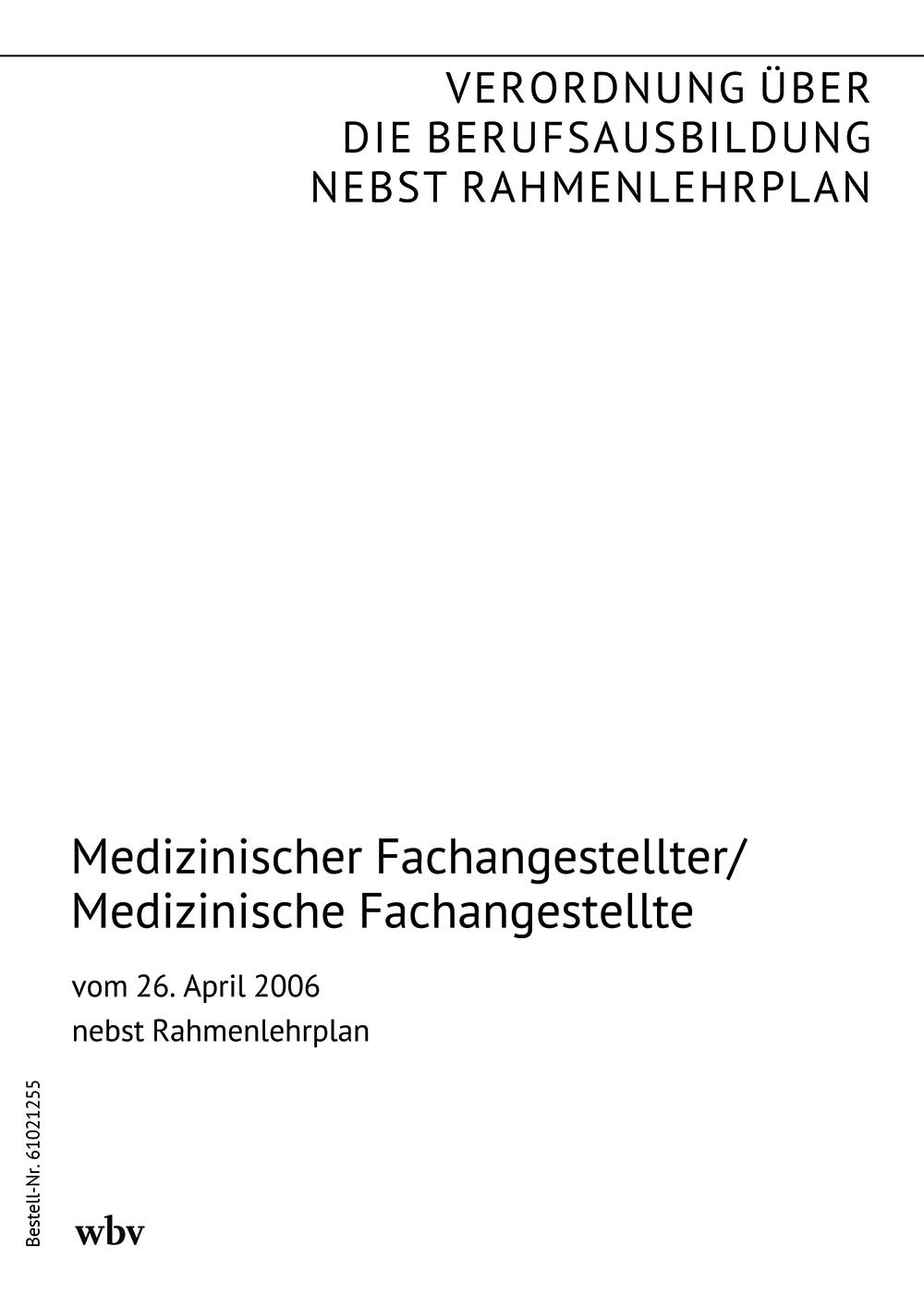 Verordnung über die Berufsausbildung zum Medizinischen Fachangestellten/zur Medizinischen Fachangestellten vom 26. April 2006 (BGBl. I S. 1097 vom 5. Mai 2006) nebst Rahmenlehrplan (Beschluss der Kultusministerkonferenz vom 18. November 2005)