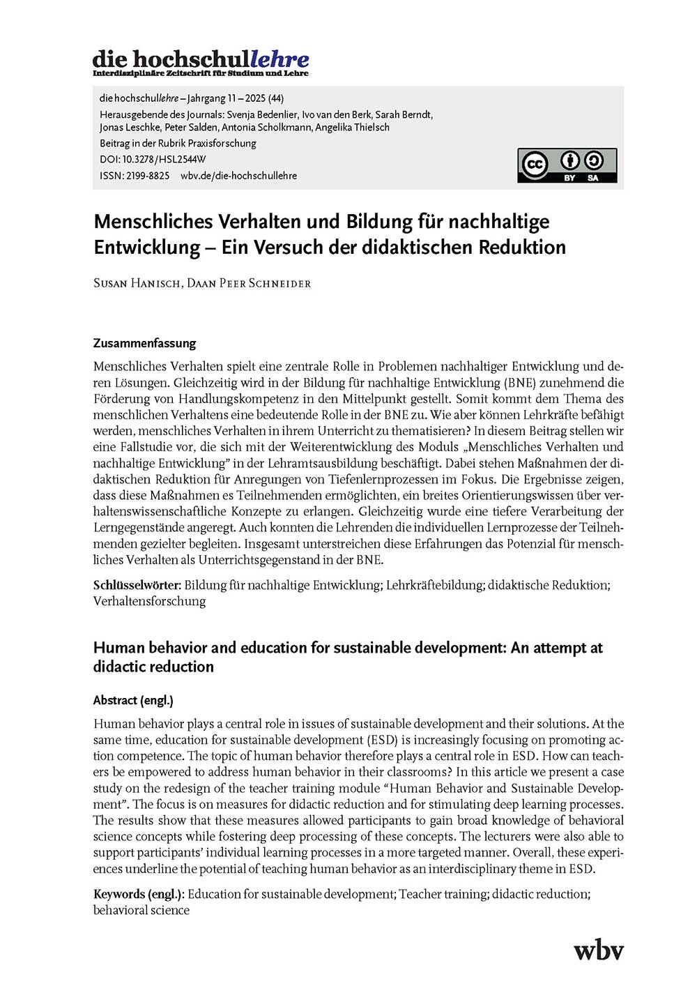 Susan Hanisch, Daan Peer Schneider (2025). Menschliches Verhalten und Bildung für nachhaltige Entwicklung - Ein Versuch der didaktischen Reduktion. die hochschullehre, Jahrgang 11/2025. DOI: 10.3278/HSL2544W