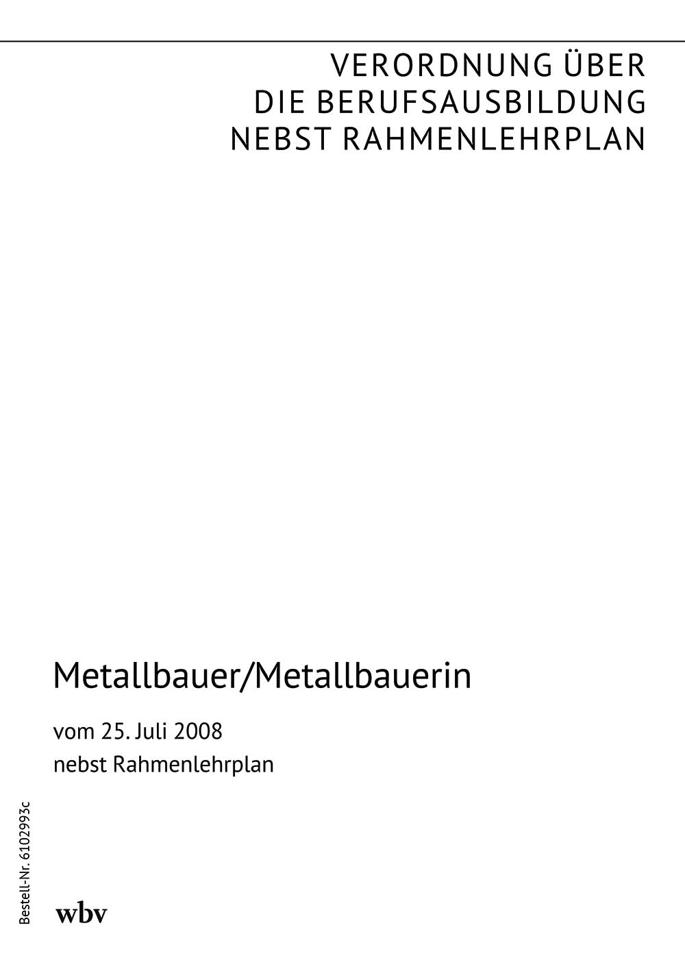 Verordnung über die Berufsausbildung zum Metallbauer/zur Metallbauerin vom 25. Juli 2008 (BGBl. I S. 1468 vom 30. Juli 2008) (BGBl.I S. 1468 vom 30. Juli 2008) nebst Rahmenlehrplan (Beschluss der Kultusministerkonferenz vom 14. Mai 2002)