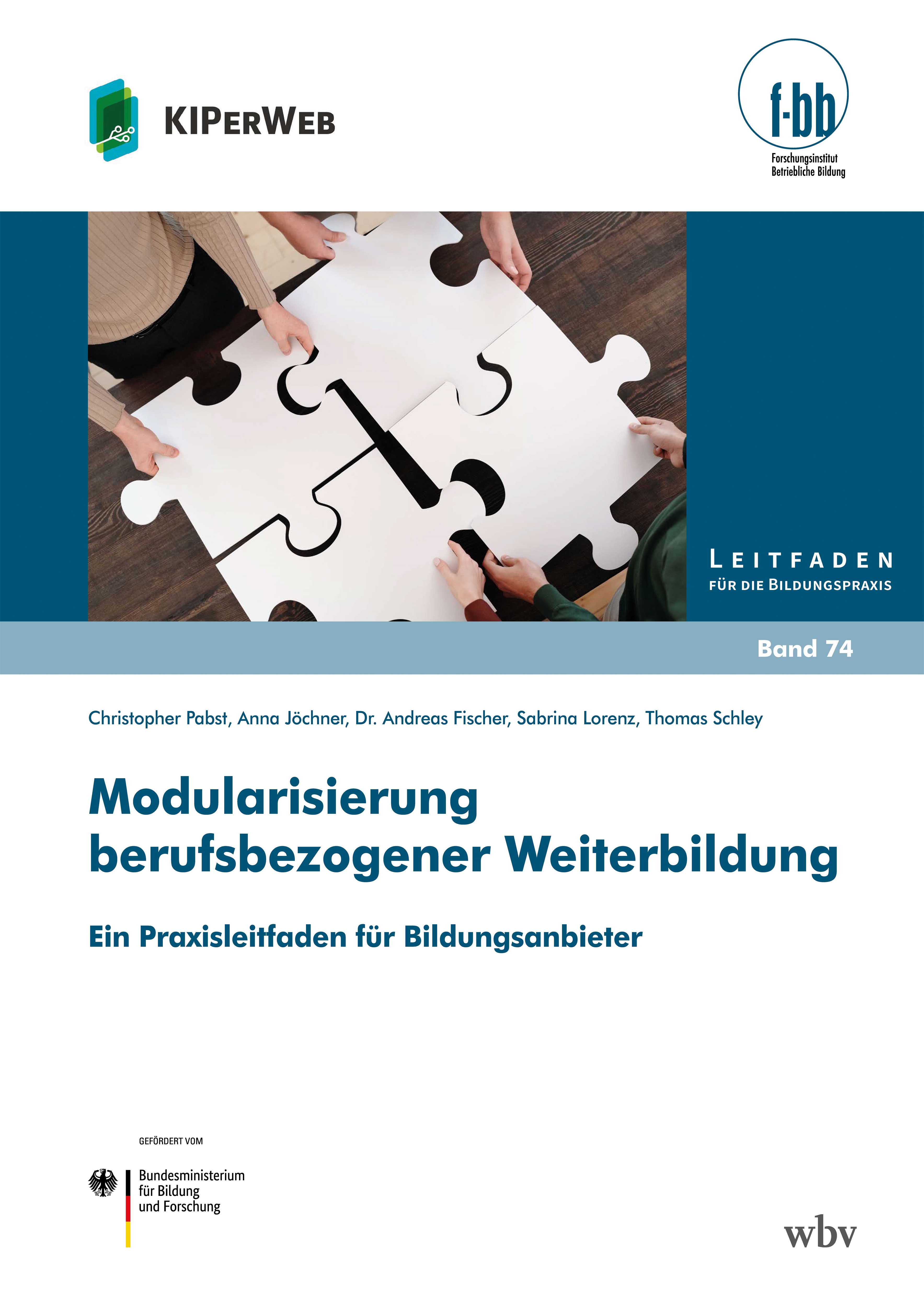 Pabst, Ch.; Jöchner, A.; Fischer, A.; Lorenz, S.; Schley, T. (2023). Modularisierung berufsbezogener Weiterbildung. Ein Praxisleitfaden für Bildungsanbieter. Bielefeld: wbv Publikation . ISBN: 978-3-7639-7645-4