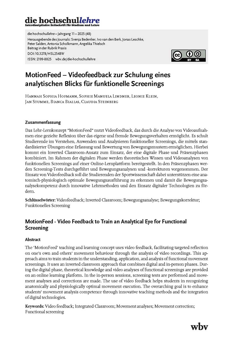 Hofmann, H. S.*, Lindner, S. M.*, Klein, L., Stumme, J., Biallas, B. & Steinberg, C. (2025). MotionFeed - Videofeedback zur Schulung eines analytischen Blicks für funktionelle Screenings. die hochschullehre, Jahrgang 11/2025. DOI: 10.3278/HSL2548W