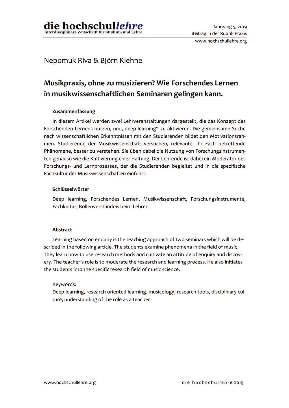 In diesem Artikel werden zwei Lehrveranstaltungen dargestellt, die das Konzept des Forschenden Lernens nutzen, um "deep learning" zu aktivieren. Die gemeinsame Suche nach wissenschaftlichen Erkenntnissen mit den Studierenden bildet den Motivationsrahmen. Studierende der Musikwissenschaft versuchen, relevante, ihr Fach betreffende Phänomene, besser zu verstehen. Sie üben dabei die Nutzung von Forschungsinstrumenten genauso wie die Kultivierung einer Haltung. Der Lehrende ist dabei ein Moderator des Forschungs- und Lernprozesses, der die Studierenden begleitet und in die spezifische Fachkultur der Musikwissenschaften einführt.