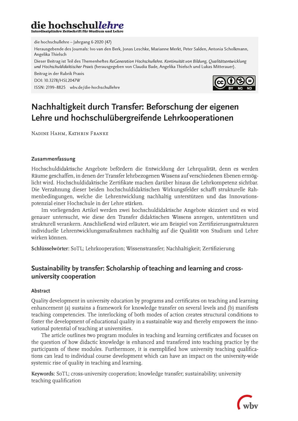 Hahm, N. & Franke, K. (2020). Nachhaltigkeit durch Transfer. Beforschung der eigenen Lehre und hochschulübergreifende Lehrkooperationen. die hochschullehre, Jahrgang 6/2020. DOI: 10.3278/HSL2047W