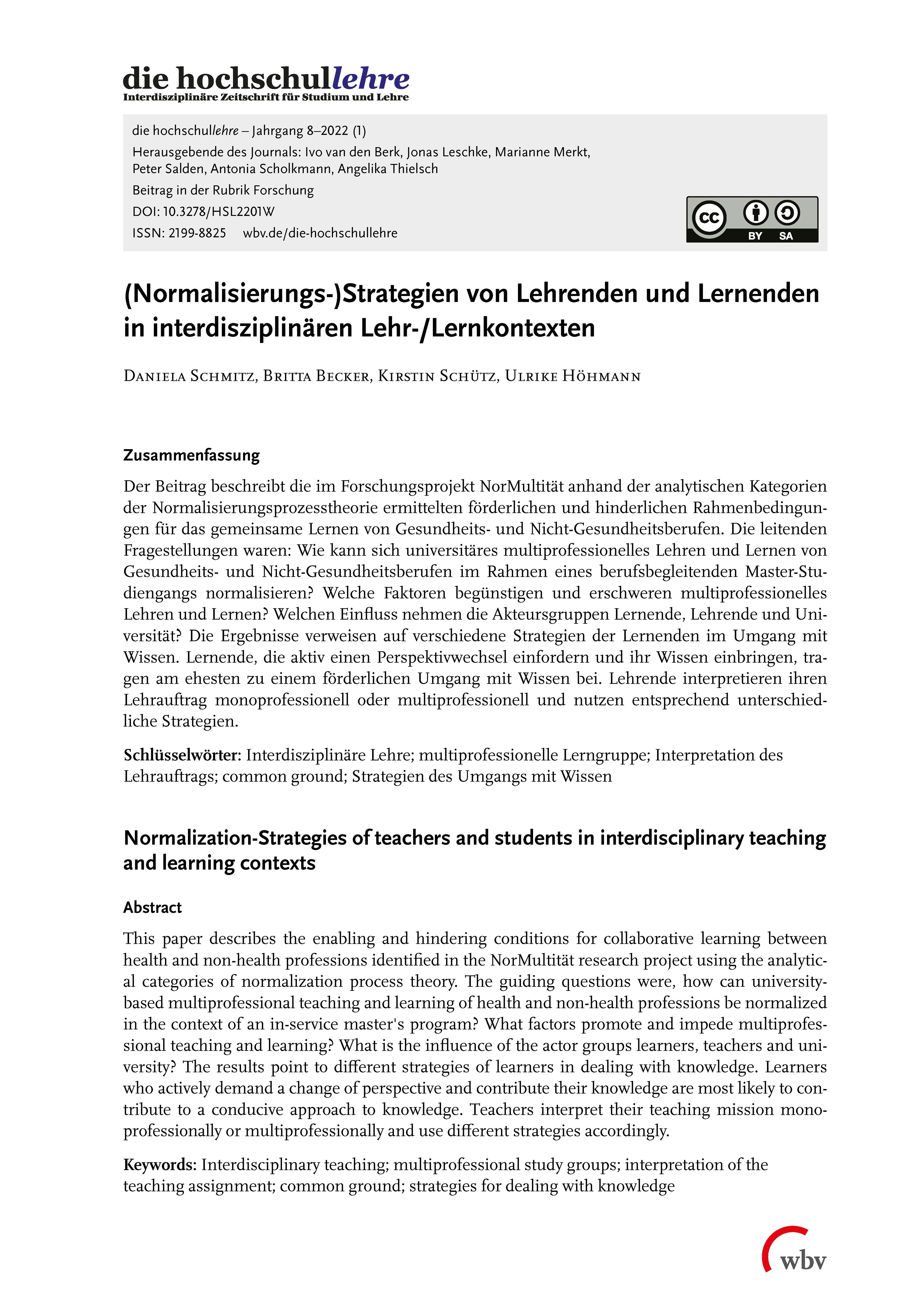 Schmitz, D., Becker, B., Schütz, K. & Höhmann, U. (2022). (Normalisierungs-)Strategien von Lehrenden und Lernenden in interdisziplinären Lehr-/Lernkontexten, die hochschullehre, Jahrgang 8/2022. DOI: 10.3278/HSL2201W
