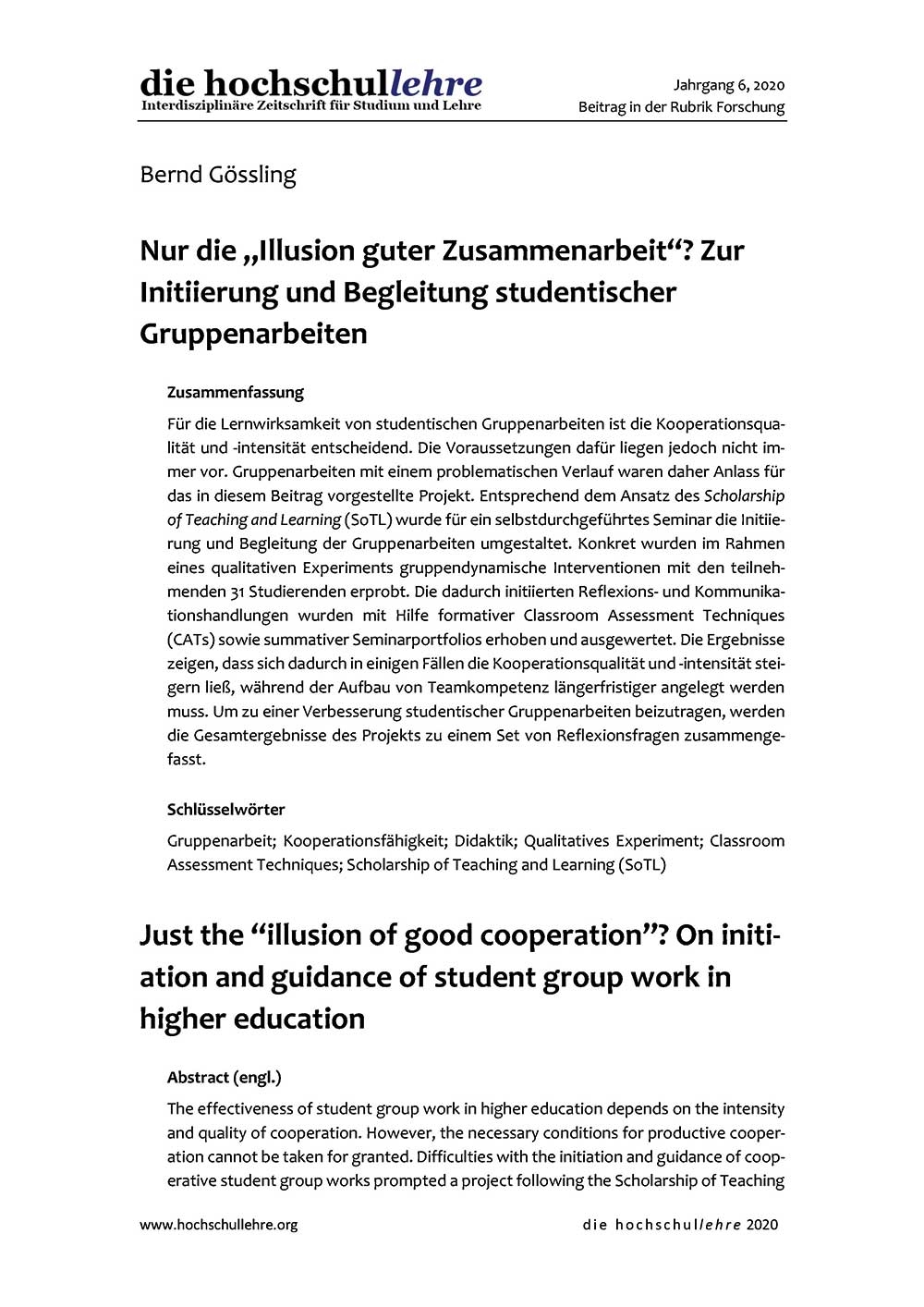 Gössling, B. (2020). Nur die „Illusion guter Zusammenarbeit"? Zur Initiierung und Begleitung studentischer Gruppenarbeiten. die hochschullehre, Jahrgang 6/2020.