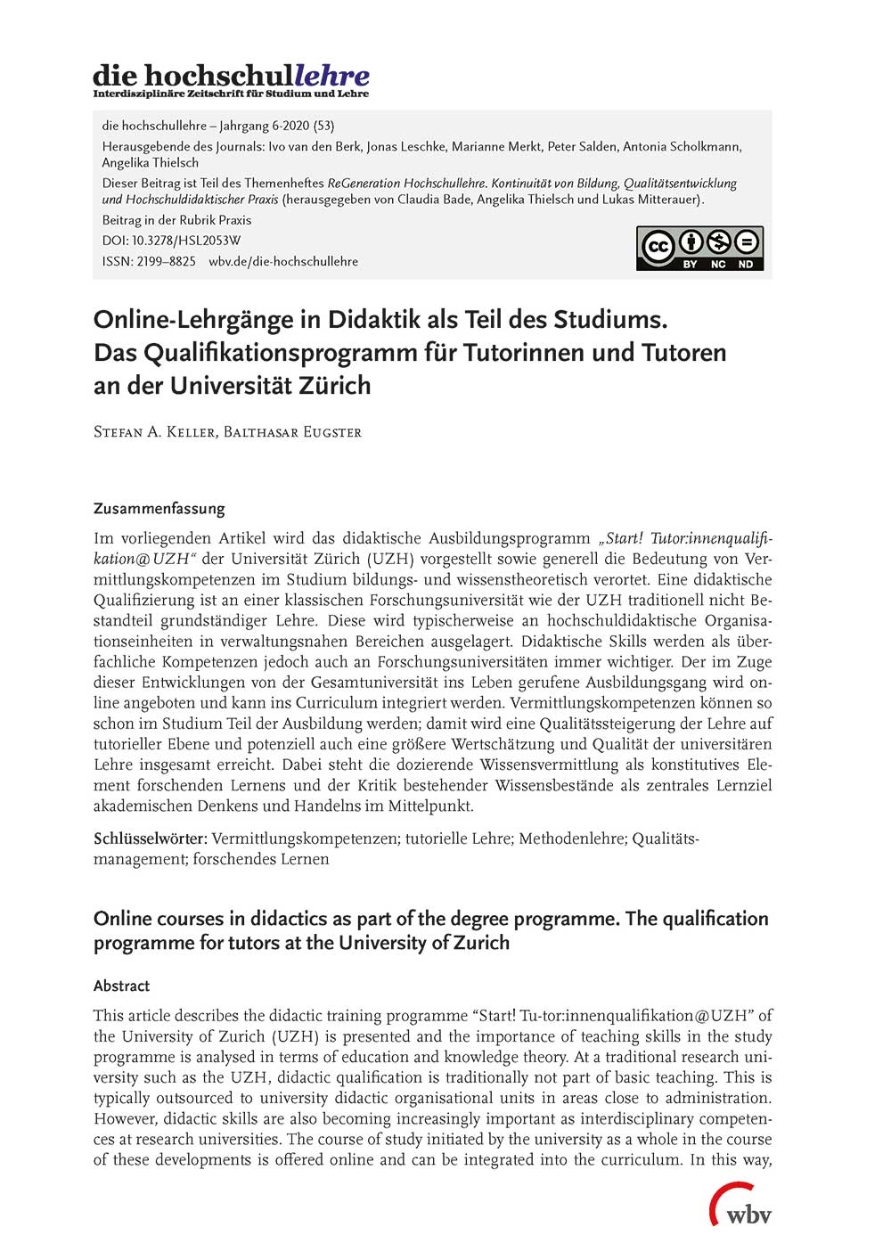 Keller, S. A. & Eugster, B. (2020). Online-Lehrgänge in Didaktik als Teil des Studiums. Das Qualifikationsprogramm für Tutorinnen und Tutoren an der Universität Zürich. die hochschullehre, Jahrgang 6/2020. DOI: 10.3278/HSL2053W.