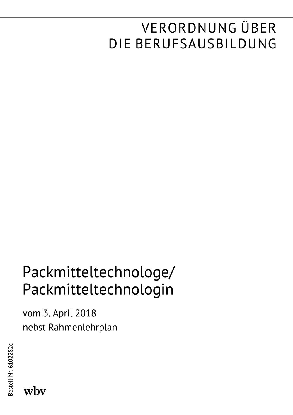 Verordnung über die Berufsausbildung zum Packmitteltechnologen/zur Packmitteltechnologin vom 20. Mai 2011 (BGBl. I S. 988 vom 30. Mai 2011), zuletzt geändert durch die Verordnung vom 3. April 2018 (BGBl. I S. 429 vom 6. April 2018) nebst Rahmenlehrplan (Beschluss der Kultusministerkonferenz vom 25. März 2011)