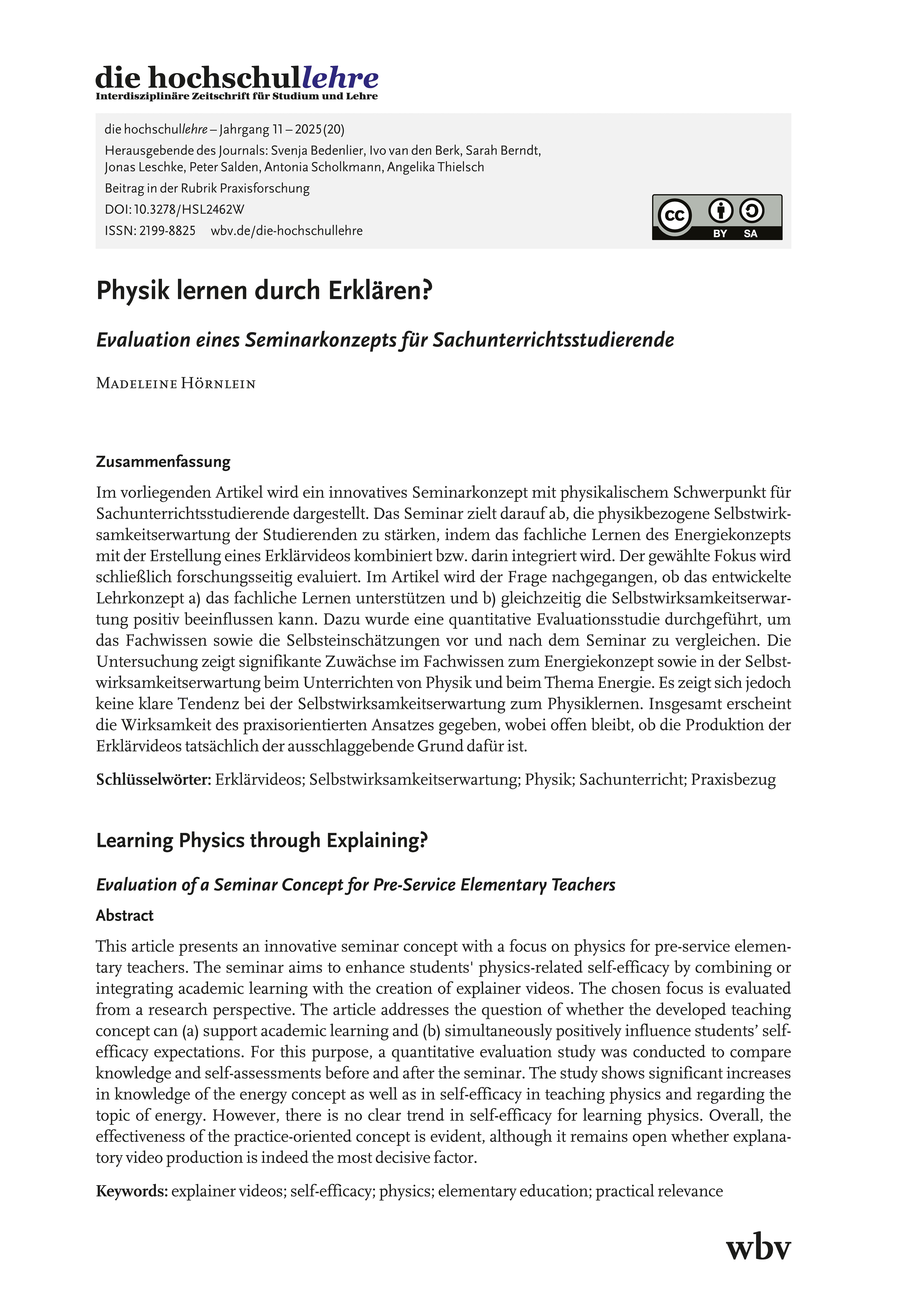 Im vorliegenden Artikel wird ein innovatives Seminarkonzept mit physikalischem Schwerpunkt für Sachunterrichtsstudierende dargestellt. Das Seminar zielt darauf ab, die physikbezogene Selbstwirksamkeitserwartung der Studierenden zu stärken, indem das fachliche Lernen des Energiekonzepts mit der Erstellung eines Erklärvideos kombiniert bzw. darin integriert wird. Der gewählte Fokus wird schließlich forschungsseitig evaluiert. Im Artikel wird der Frage nachgegangen, ob das entwickelte Lehrkonzept a) das fachliche Lernen unterstützen und b) gleichzeitig die Selbstwirksamkeitserwartung positiv beeinflussen kann. Dazu wurde eine quantitative Evaluationsstudie durchgeführt, um das Fachwissen sowie die Selbsteinschätzungen vor und nach dem Seminar zu vergleichen. Die Untersuchung zeigt signifikante Zuwächse im Fachwissen zum Energiekonzept sowie in der Selbstwirksamkeitserwartung beim Unterrichten von Physik und beim Thema Energie. Es zeigt sich jedoch keine klare Tendenz bei der Selbstwirksamkeitserwartung zum Physiklernen. Insgesamt erscheint die Wirksamkeit des praxisorientierten Ansatzes gegeben, wobei offen bleibt, ob die Produktion der Erklärvideos tatsächlich der ausschlaggebende Grund dafür ist.