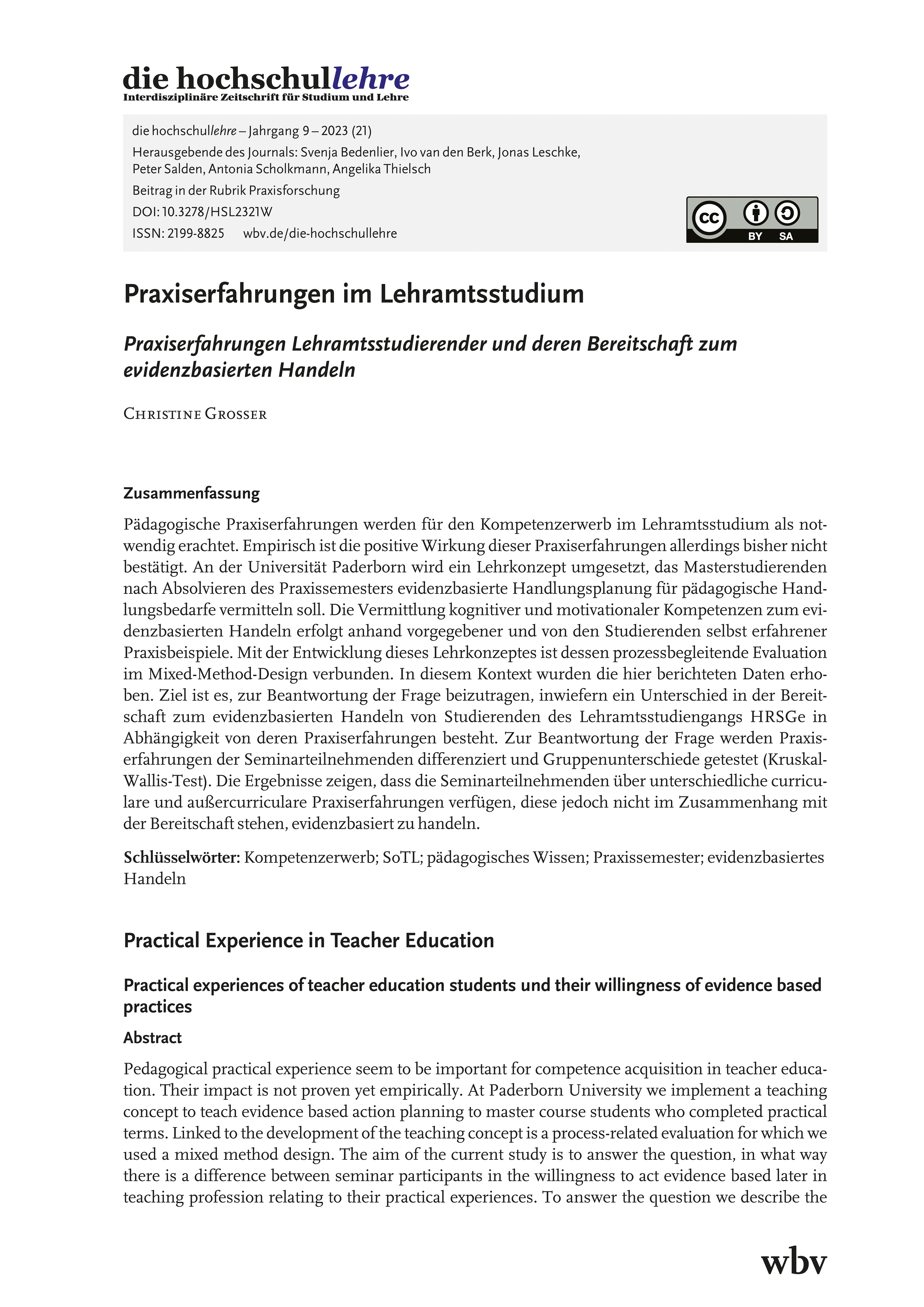 Grosser, Ch. (2023). Praxiserfahrungen im Lehramtsstudium. Praxiserfahrungen Lehramtsstudierender und deren Bereitschaft zum evidenzbasierten Handeln. die hochschullehre, Jahrgang 9/2023. DOI: 10.3278/HSL2321W.