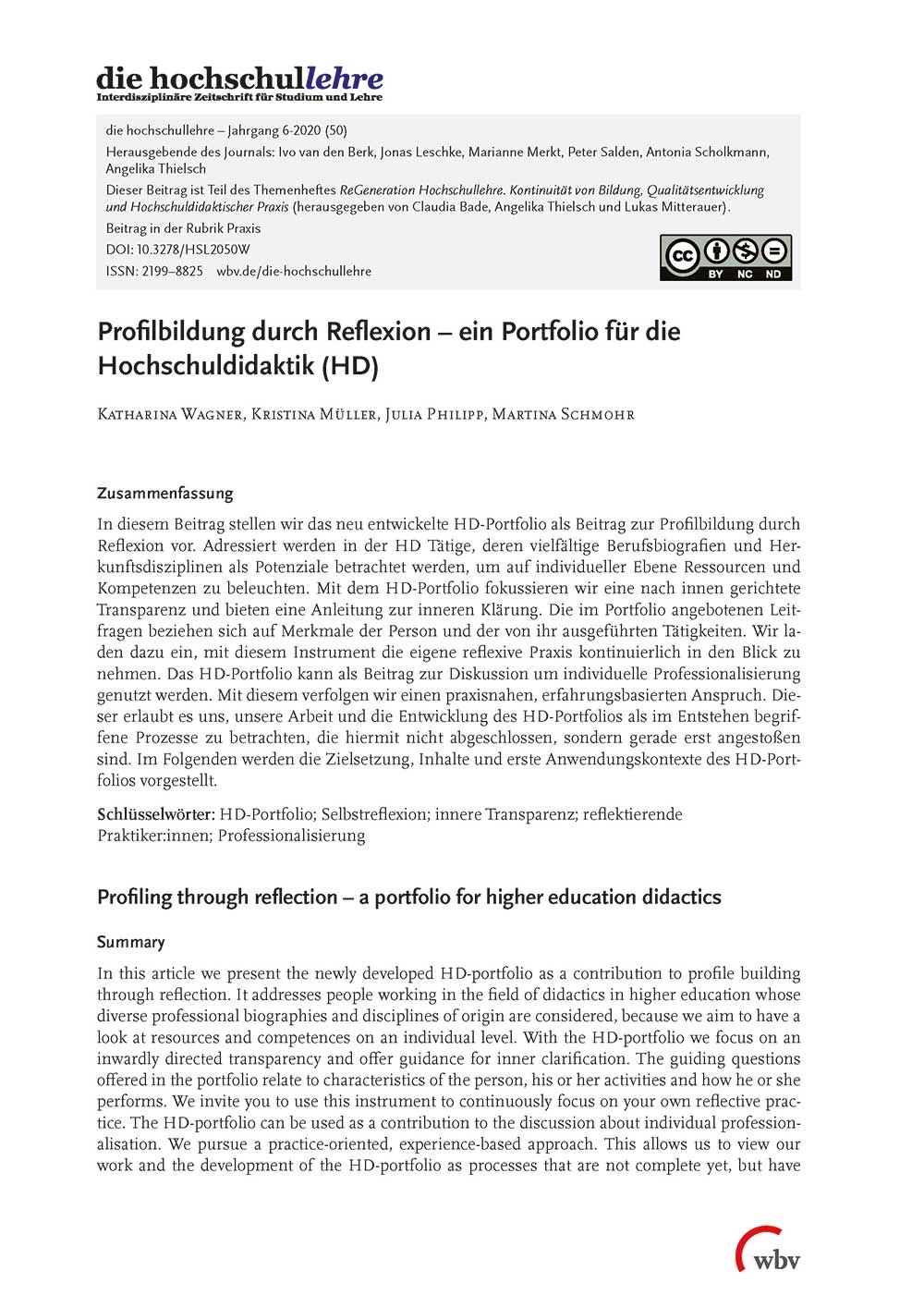 Wagner, K., Müller, K., Philipp, J. & Schmohr, M. (2020). Profilbildung durch Reflexion - ein Portfolio für die Hochschuldidaktik (HD). die hochschullehre, Jahrgang 6/2020. DOI: 10.3278/HSL2050W.