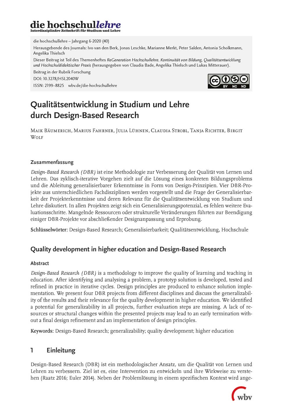 Bäumerich, M., Fahrner, M., Lühnen, J., Richter, T., Strobl, C. & Wolf, B. (2020). Qualitätsentwicklung in Studium und Lehre durch Design-Based Research. die hochschullehre, Jahrgang 6/2020. DOI: 10.3278/HSL2040W