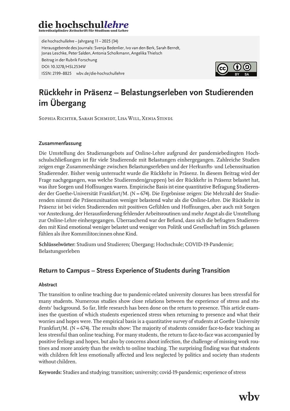Die Umstellung des Studienangebots auf Online-Lehre aufgrund der pandemiebedingten Hochschulschließungen ist für viele Studierende mit Belastungen einhergegangen. Zahlreiche Studien zeigen enge Zusammenhänge zwischen Belastungserleben und der Herkunfts- und Lebenssituation Studierender. Bisher wenig untersucht wurde die Rückkehr in Präsenz. In diesem Beitrag wird der Frage nachgegangen, was welche Studierenden(gruppen) bei der Rückkehr in Präsenz belastet hat, was ihre Sorgen und Hoffnungen waren. Empirische Basis ist eine quantitative Befragung Studierender der Goethe-Universität Frankfurt/M. (N = 674). Die Ergebnisse zeigen: Die Mehrzahl der Studierenden nimmt die Präsenzsituation weniger belastend wahr als die Online-Lehre. Die Rückkehr in Präsenz ist bei vielen Studierenden mit positiven Gefühlen und Hoffnungen, aber auch mit Sorgen vor Ansteckung, der Herausforderung fehlender Arbeitsroutinen und mehr Angst als die Umstellung zur Online-Lehre einhergegangen. Überraschend war der Befund, dass sich die befragten Studierenden mit Kind emotional weniger belastet und weniger von Politik und Gesellschaft im Stich gelassen fühlen als ihre Kommiliton:innen ohne Kind.