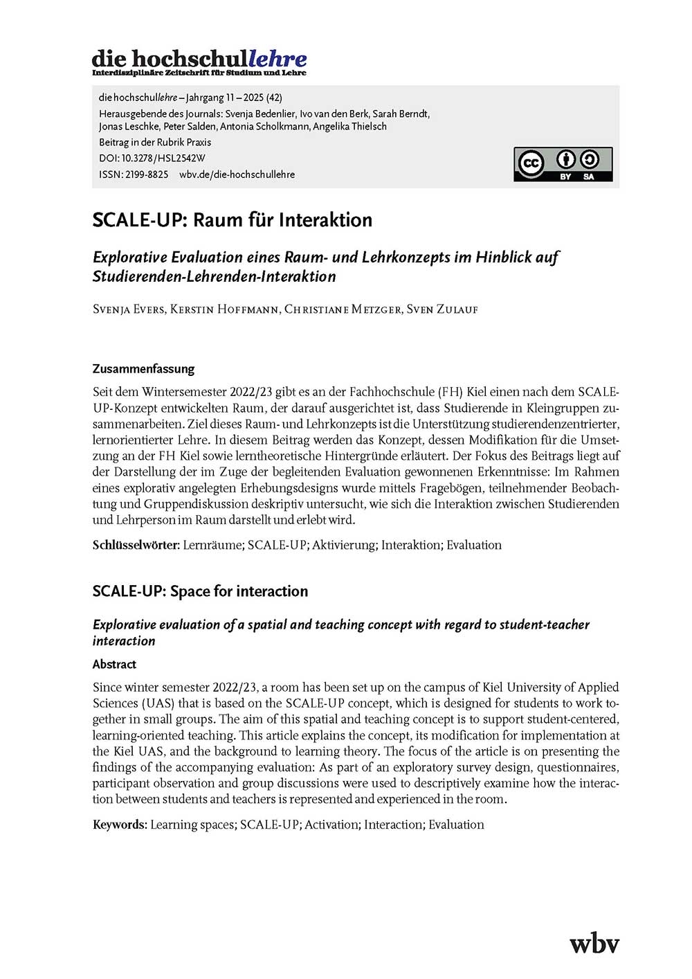 Evers, S., Hoffmann, K., Metzger, Ch. & Zulauf, S. (2025). SCALE-UP: Raum für Interaktion. Explorative Evaluation eines Raum- und Lehrkonzepts im Hinblick auf Studierenden-Lehrenden-Interaktion. die hochschullehre, Jahrgang 11/2025. DOI: 10.3278/HSL2542W.