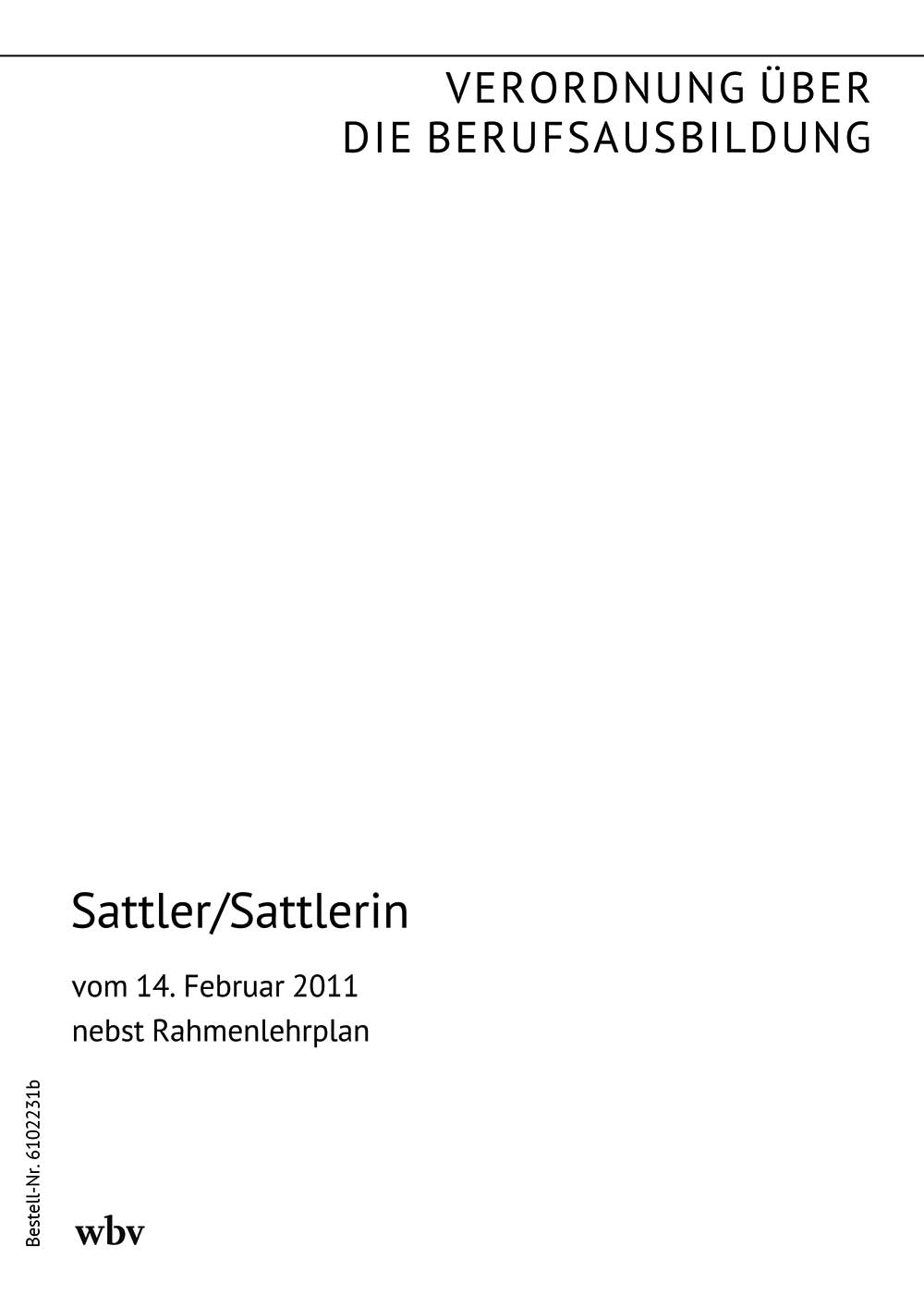 Verordnung über die Berufsausbildung zum Sattler/zur Sattlerin vom 23. März 2005 (BGBl. I S. 913 vom 30. März 2005) nebst Rahmenlehrplan (Beschluss der Kultusministerkonferenz vom 18. März 2005) zuletzt geändert durch die Verordnung vom 14. Februar 2011 (BGBl. I S. 263 vom 25. Februar 2011)