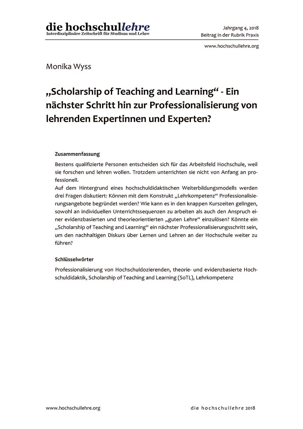 Auf dem Hintergrund eines hochschuldidaktischen Weiterbildungsmodells werden drei Fragen diskutiert: Können mit dem Konstrukt "Lehrkompetenz" Professionalisierungsangebote begründet werden? Wie kann es in den knappen Kurszeiten gelingen, sowohl an individuellen Unterrichtssequenzen zu arbeiten als auch den Anspruch einer evidenzbasierten und theorieorientierten "guten Lehre" einzulösen? Könnte ein "Scholarship of Teaching and Learning" ein nächster Professionalisierungsschritt sein, um den nachhaltigen Diskurs über Lernen und Lehren an der Hochschule weiter zu führen?