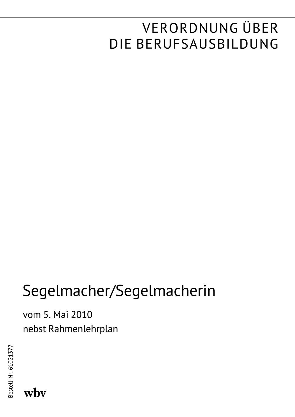 Verordnung über die Berufsausbildung zum Segelmacher/zur Segelmacherin vom 5. Mai 2010 (BGBl. I S. 564 vom 14. Mai 2010) nebst Rahmenlehrplan (Beschluss der Kultusministerkonferenz vom 23. März 2010)