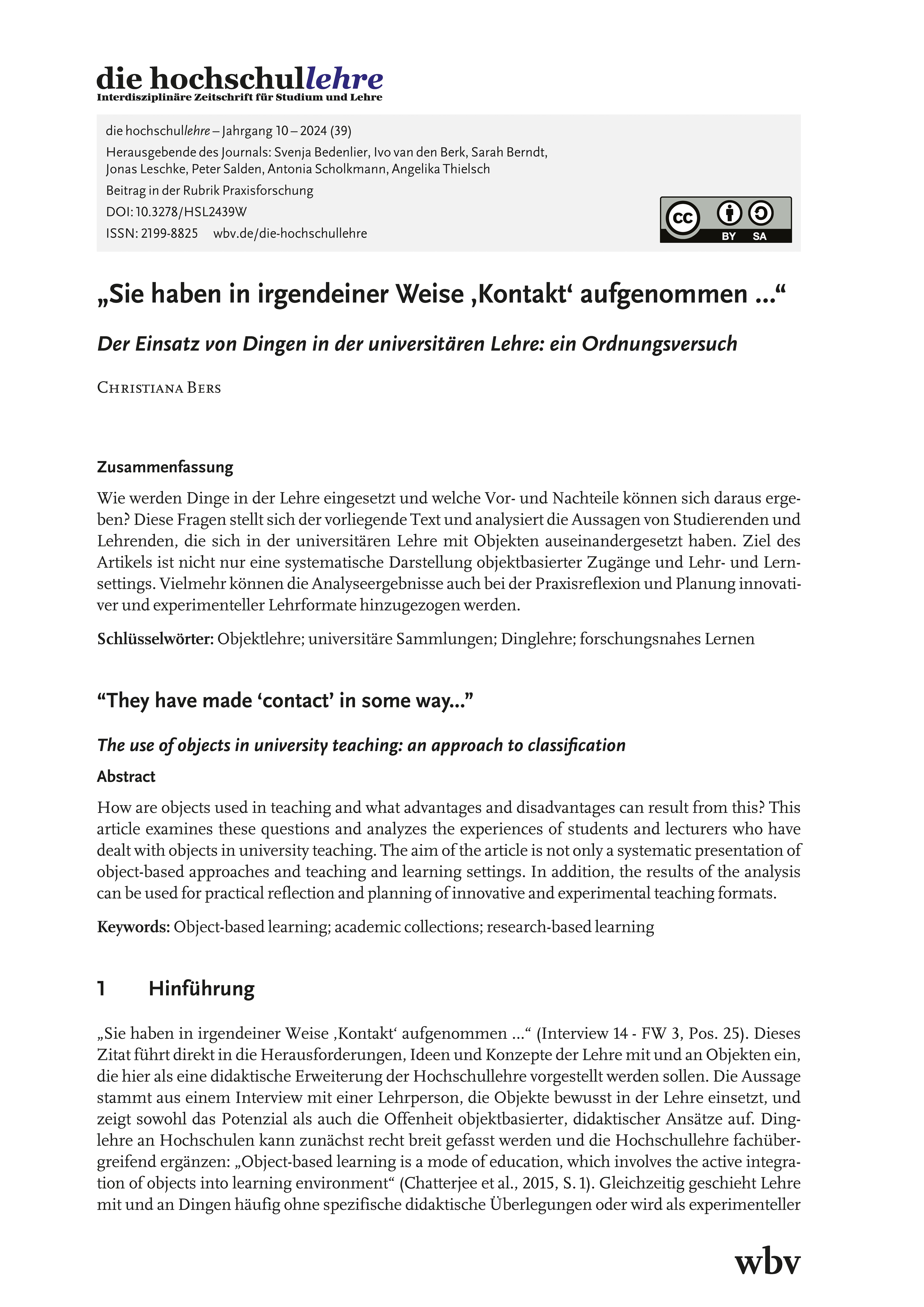 Bers, C. (2024). „Sie haben in irgendeiner Weise ,Kontakt' aufgenommen ..." - Der Einsatz von Dingen in der universitären Lehre: ein Ordnungsversuch. die hochschullehre, Jahrgang 10/2024. DOI: 10.3278/HSL2439W
