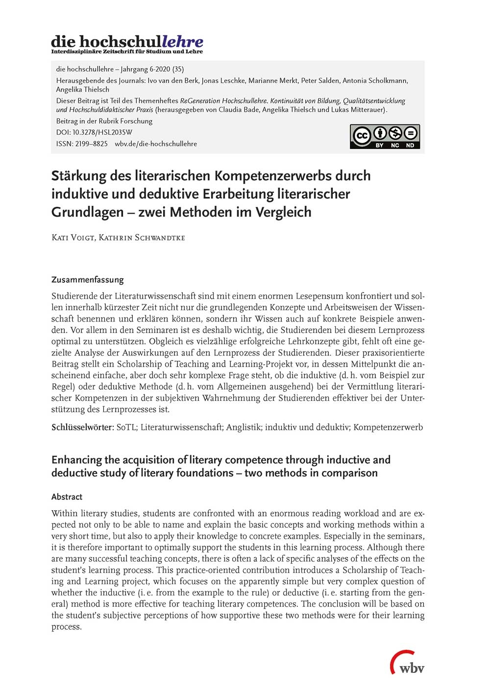 Voigt, K. & Schwandtke, K. (2020). Stärkung des literarischen Kompetenzerwerbs durch induktive und deduktive Erarbeitung literarischer Grundlagen. Zwei Methoden im Vergleich. die hochschullehre, Jahrgang 6/2020. DOI: 10.3278/HSL2035W