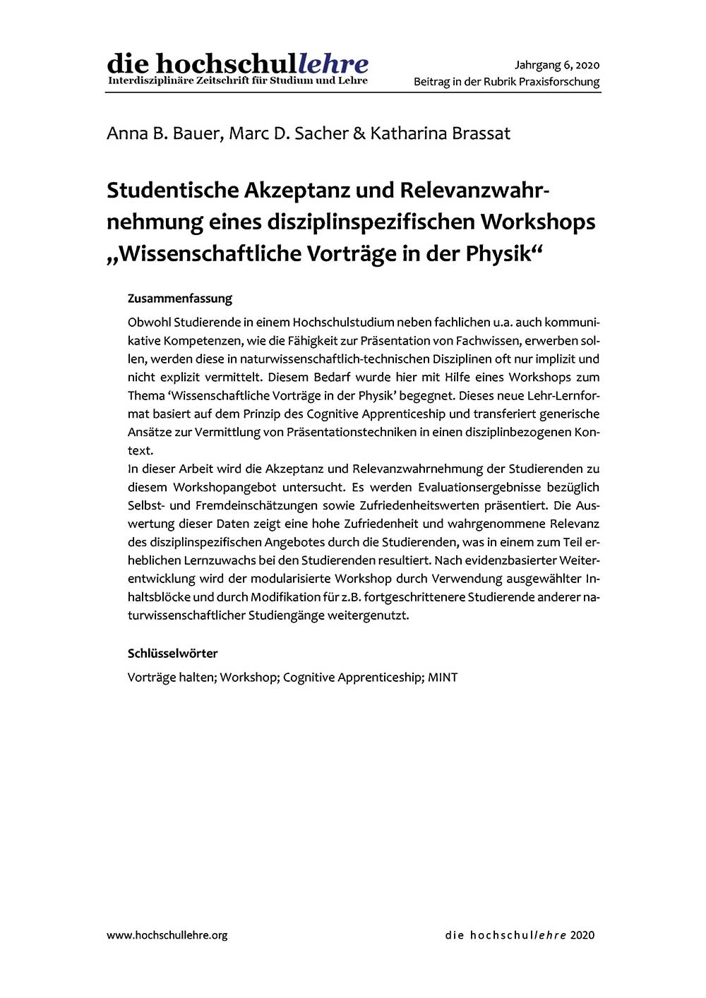 Bauer, A. B., Sacher, M. D. & Brassat, K. (2020). Studentische Akzeptanz und Relevanzwahrnehmung eines disziplinspezifischen Workshops „Wissenschaftliche Vorträge in der Physik". die hochschullehre, Jahrgang 6/2020.