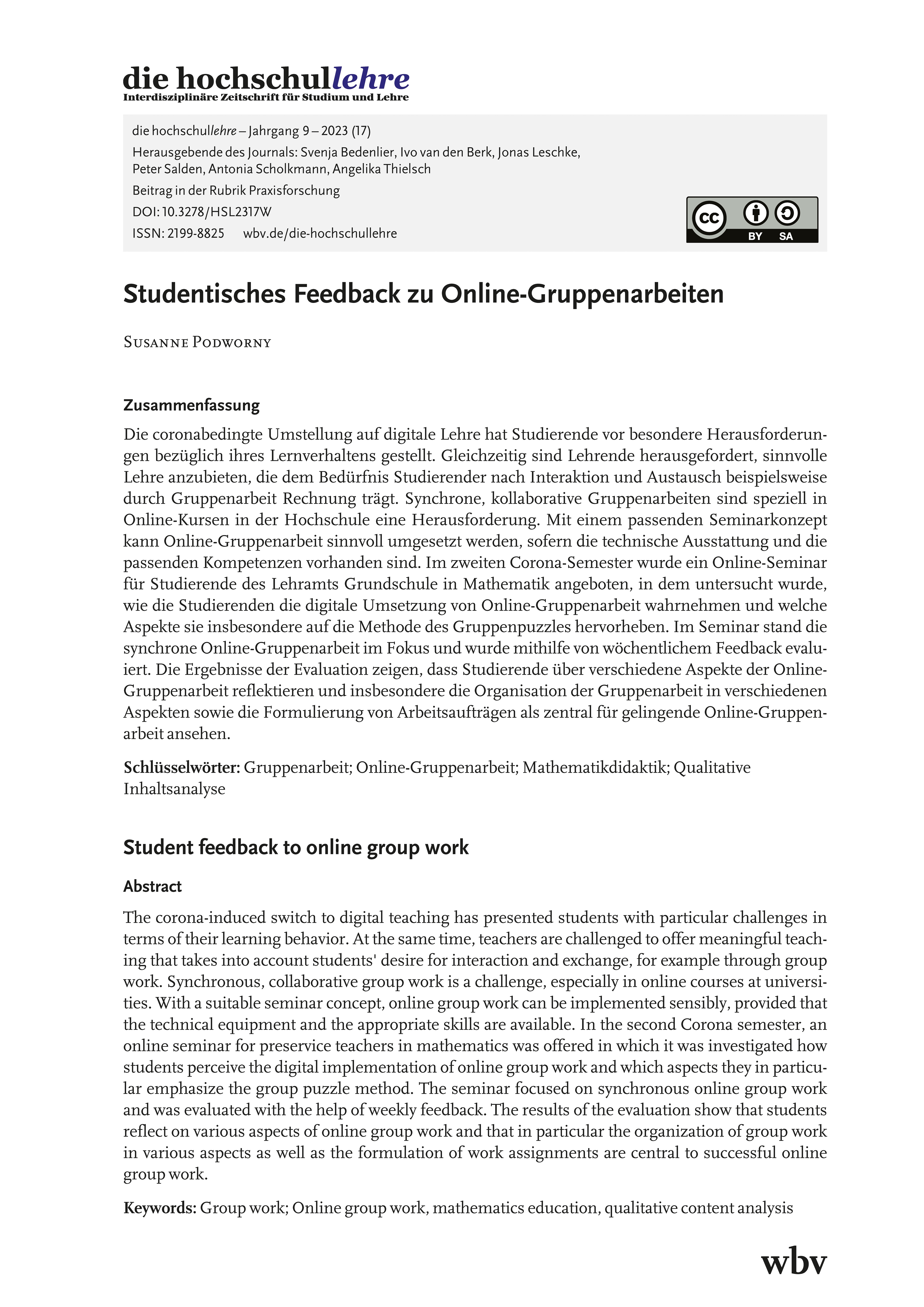 Podworny, S. (2023). Studentisches Feedback zu Online-Gruppenarbeiten. die hochschullehre, Jahrgang 9/2023. DOI: 10.3278/HSL2317W.