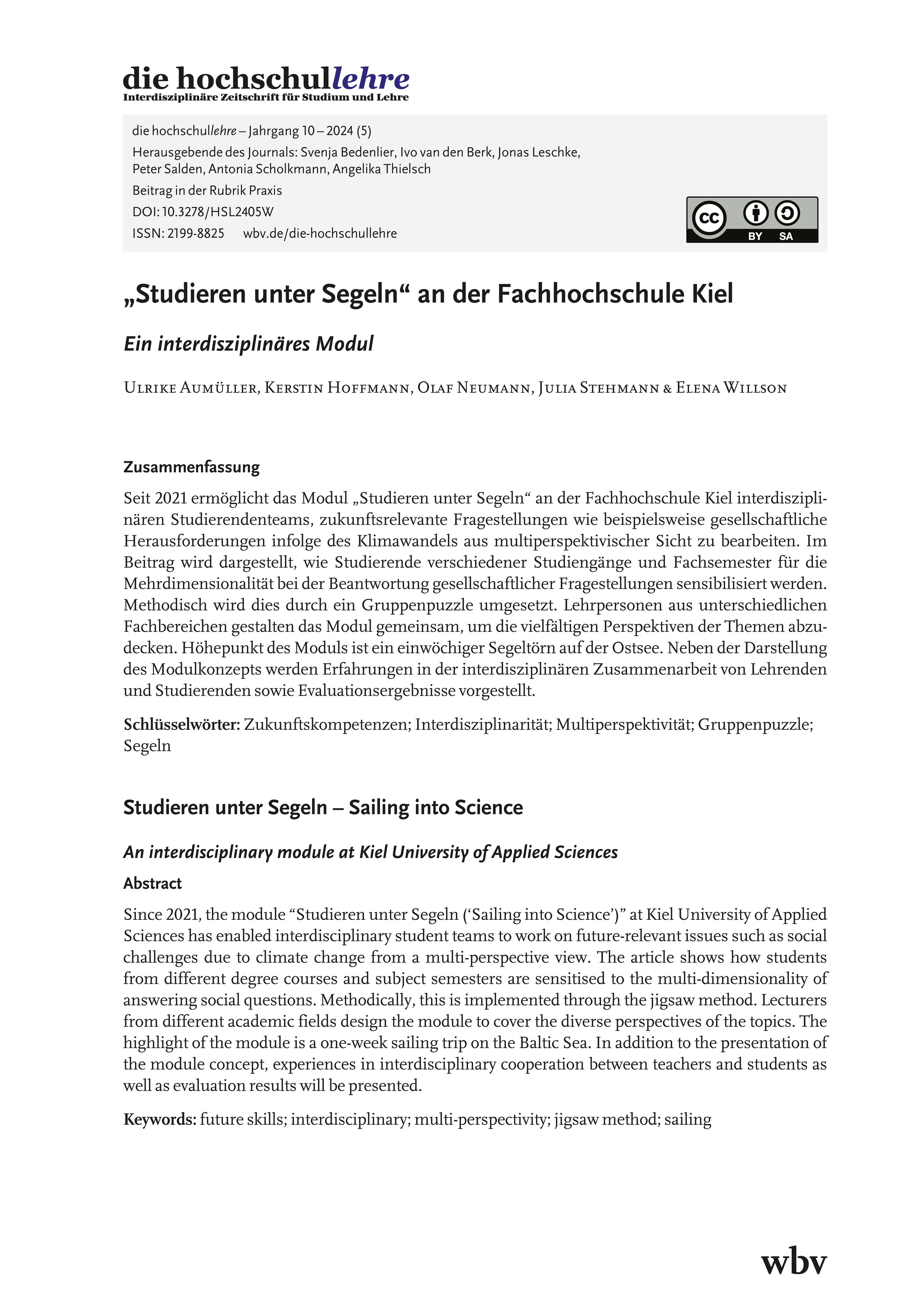 Aumüller, U., Hoffmann, K., Neumann, O., Stehmann, J. & Willson, E. (2024). "Studieren unter Segeln" an der Fachhochschule Kiel. Ein interdisziplinäres Modul. die hochschullehre, Jahrgang 10/2024. DOI: 10.3278/HSL2405W.