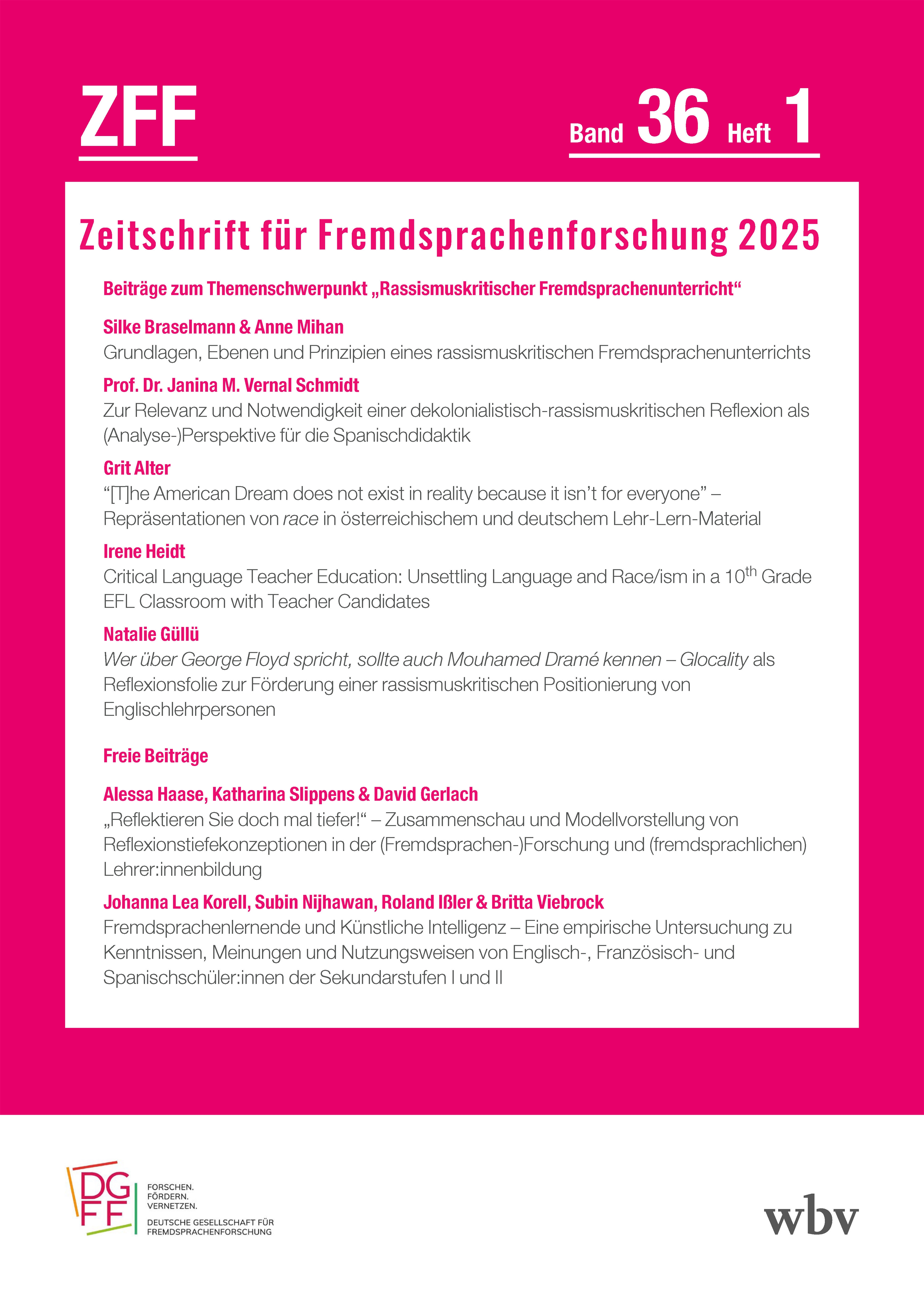 Alter, Grit (2024). "[T]he American Dream does not exist in reality because it isn't for everyone": Repräsentationen von race in österreichischem und deutschem Lehr-Lern-Material. Zeitschrift für Fremdsprachenforschung, 36(1), 57-71. Bielefeld: wbv Publikation. https://doi.org/10.3278/ZFF2501W005