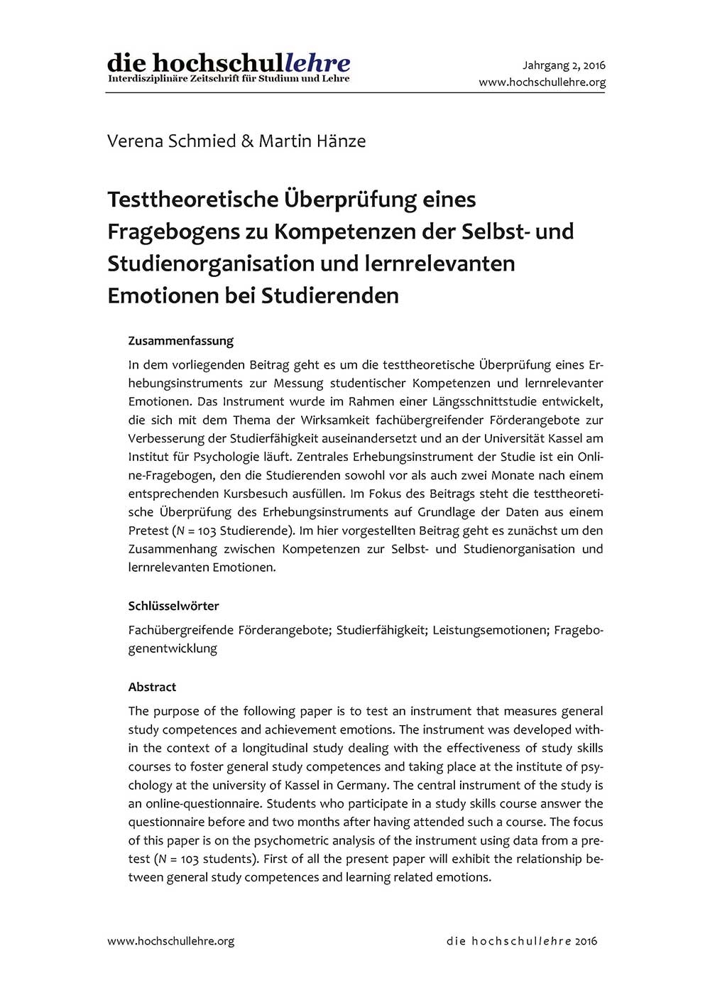 In dem vorliegenden Beitrag geht es um die testtheoretische Überprüfung eines Erhebungsinstruments zur Messung studentischer Kompetenzen und lernrelevanter Emotionen. Das Instrument wurde im Rahmen einer Längsschnittstudie entwickelt, die sich mit dem Thema der Wirksamkeit fachübergreifender Förderangebote zur Verbesserung der Studierfähigkeit auseinandersetzt und an der Universität Kassel am Institut für Psychologie läuft. Zentrales Erhebungsinstrument der Studie ist ein Online-Fragebogen, den die Studierenden sowohl vor als auch zwei Monate nach einem entsprechenden Kursbesuch ausfüllen. Im Fokus des Beitrags steht die testtheoretische Überprüfung des Erhebungsinstruments auf Grundlage der Daten aus einem Pretest (N = 103 Studierende). Im hier vorgestellten Beitrag geht es zunächst um den Zusammenhang zwischen Kompetenzen zur Selbst- und Studienorganisation und lernrelevanten Emotionen.