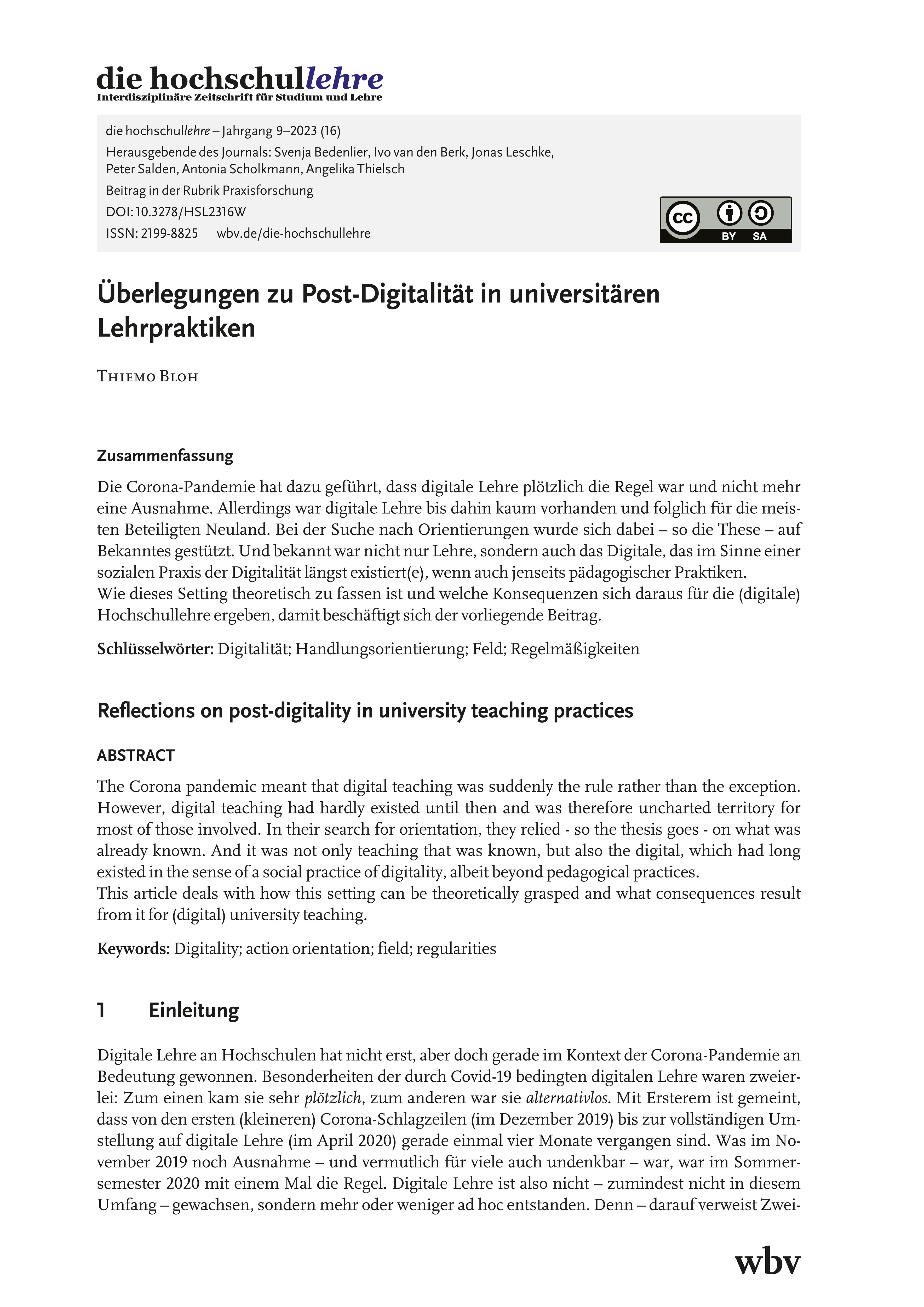 Bloh, T. (2023). Überlegungen zu Post-Digitalität in universitären Lehrpraktiken. die hochschullehre, Jahrgang 9/2023. DOI: 10.3278/HSL2316W.