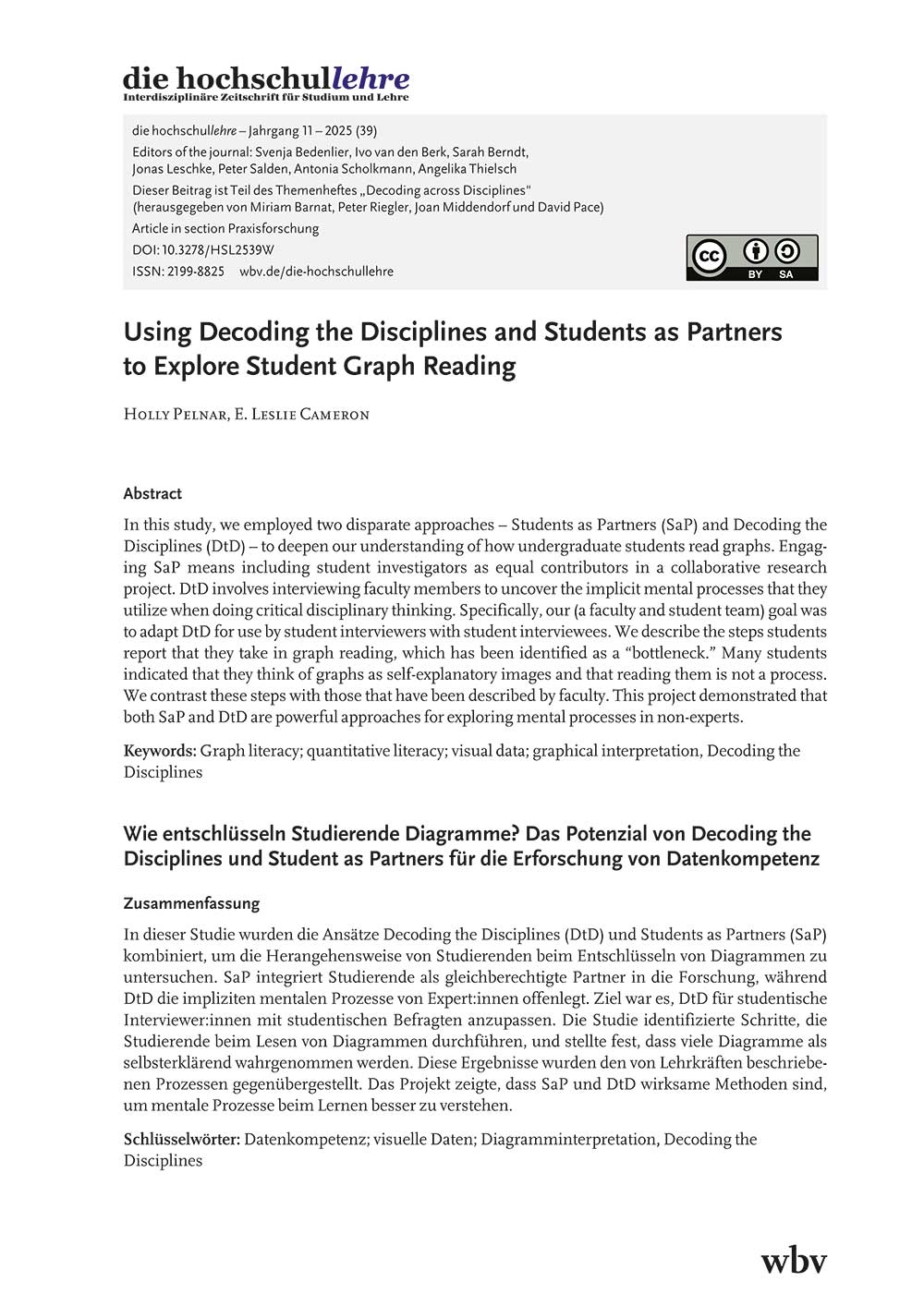 Pelnar, H. & Cameron, E. L. (2025). Using Decoding the Disciplines and students as partners to explore student graph reading. die hochschullehre, year 11/2025. DOI: 10.3278/HSL2539W.