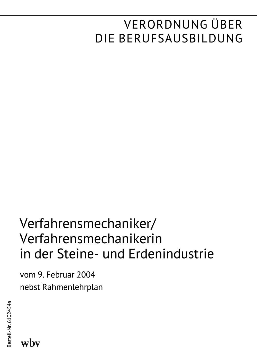Verordnung über die Berufsausbildung zum Verfahrensmechaniker/zur Verfahrensmechanikerin in der Steine- und Erdenindustrie vom 9. Februar 2004 (BGBl. I S. 180 vom 12. Februar 2004) nebst Rahmenlehrplan (Beschluss der Kultusministerkonferenz von 21. November 1996)