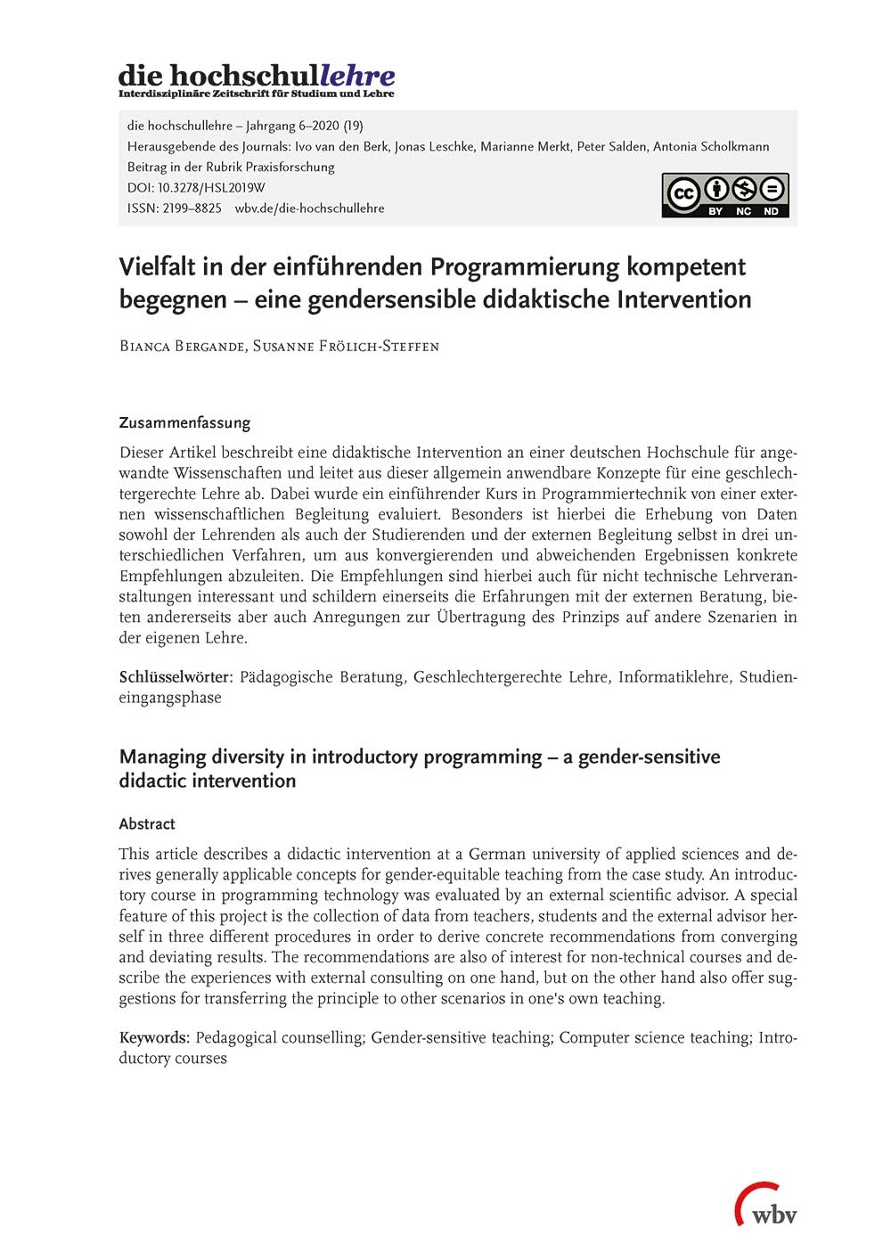 Bergande, B. & Frölich-Steffen, S. (2020). Vielfalt in der einführenden Programmierung kompetent begegnen - eine gendersensible didaktische Intervention. die hochschullehre, Jahrgang 6/2020. DOI: 10.3278/HSL2019W.