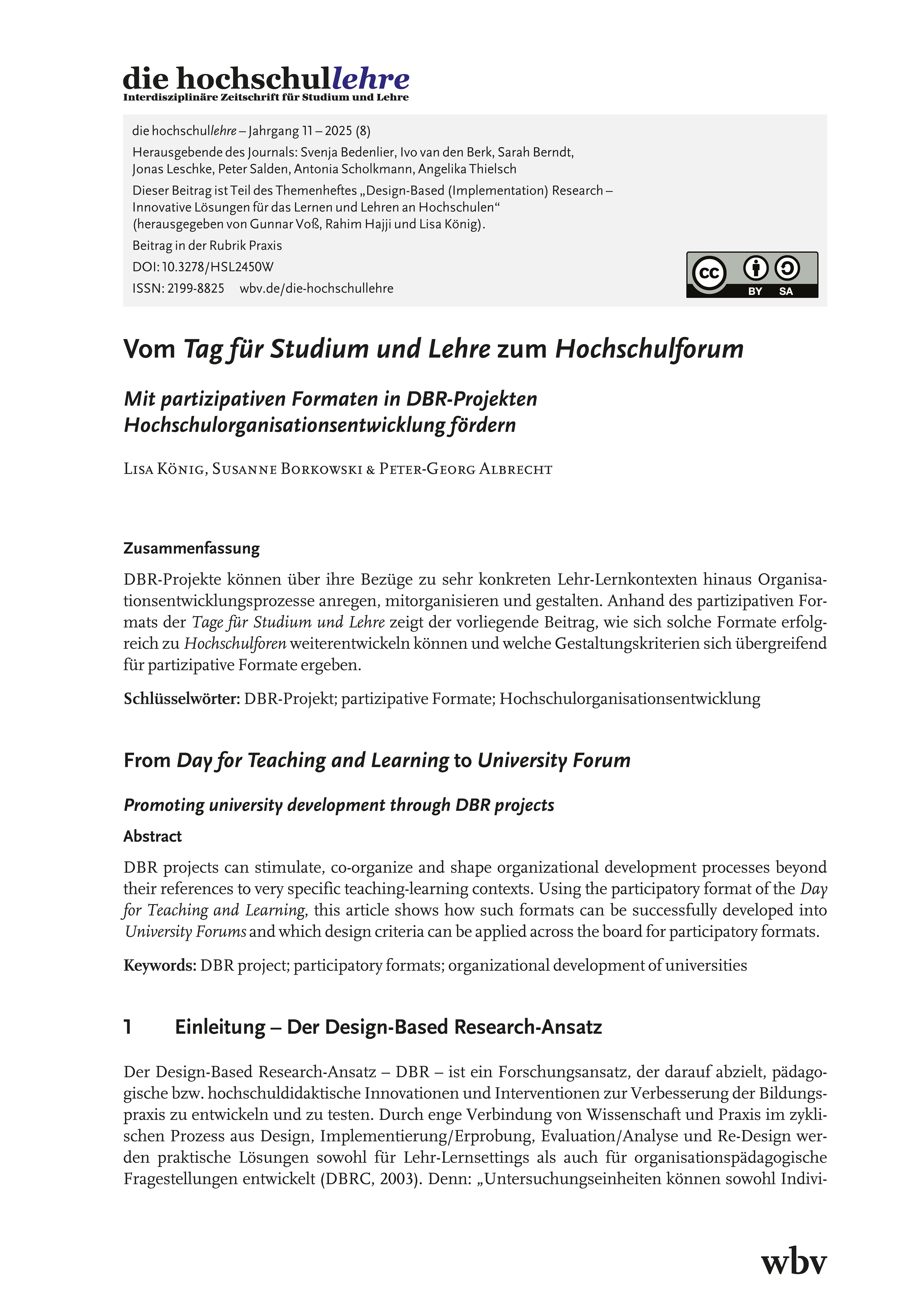 König, L., Borkowski, S. & Albrecht, P.-G. (2025). Vom Tag für Studium und Lehre zum Hochschulforum. die hochschullehre, Jahrgang 11/2025. DOI: 10.3278/HSL2450W.