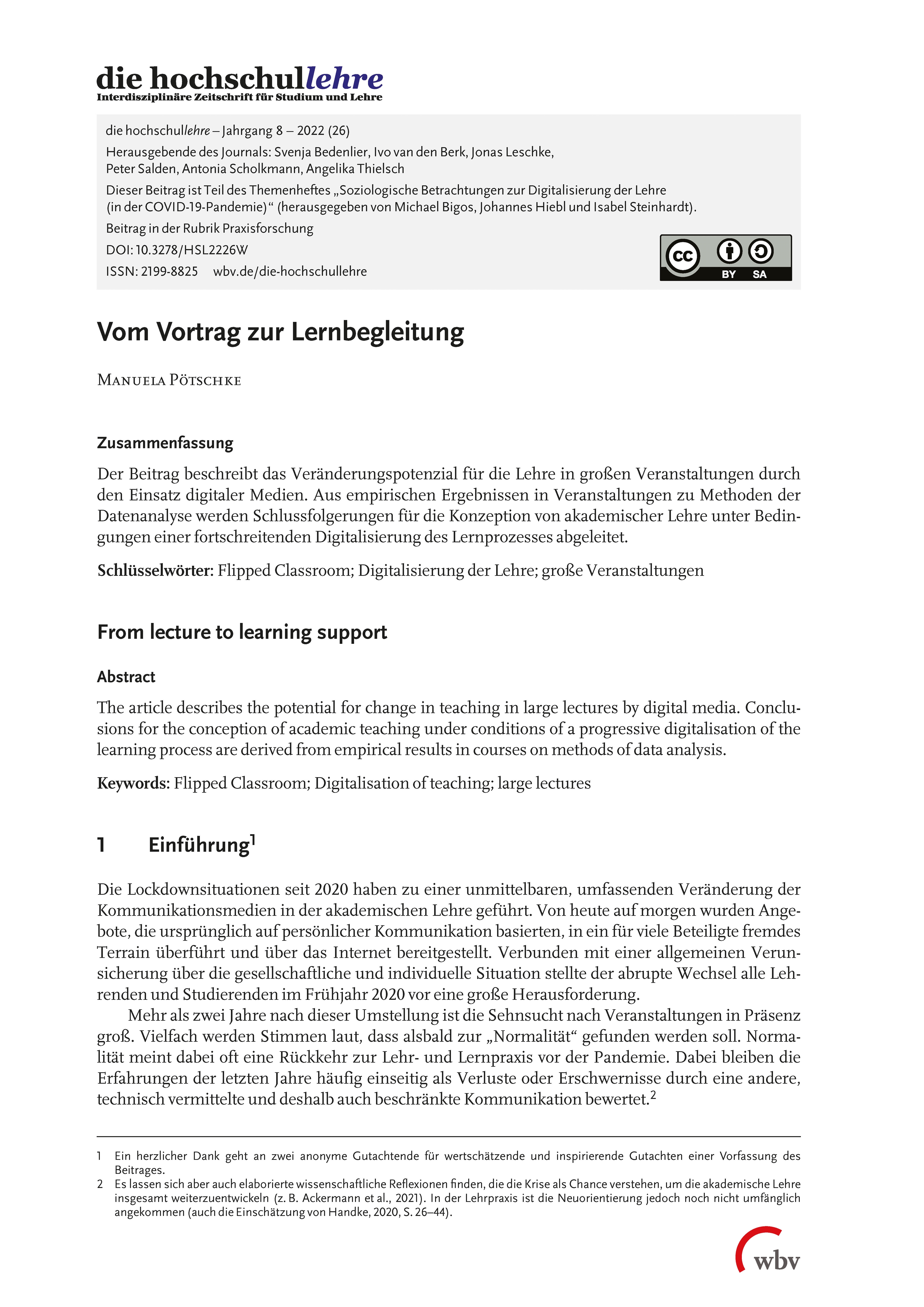 Pötschke, M. (2022). Vom Vortrag zur Lernbegleitung. die hochschullehre, Jahrgang 8/2022. DOI: 10.3278/HSL2226W. Online unter: wbv.de/die-hochschullehre