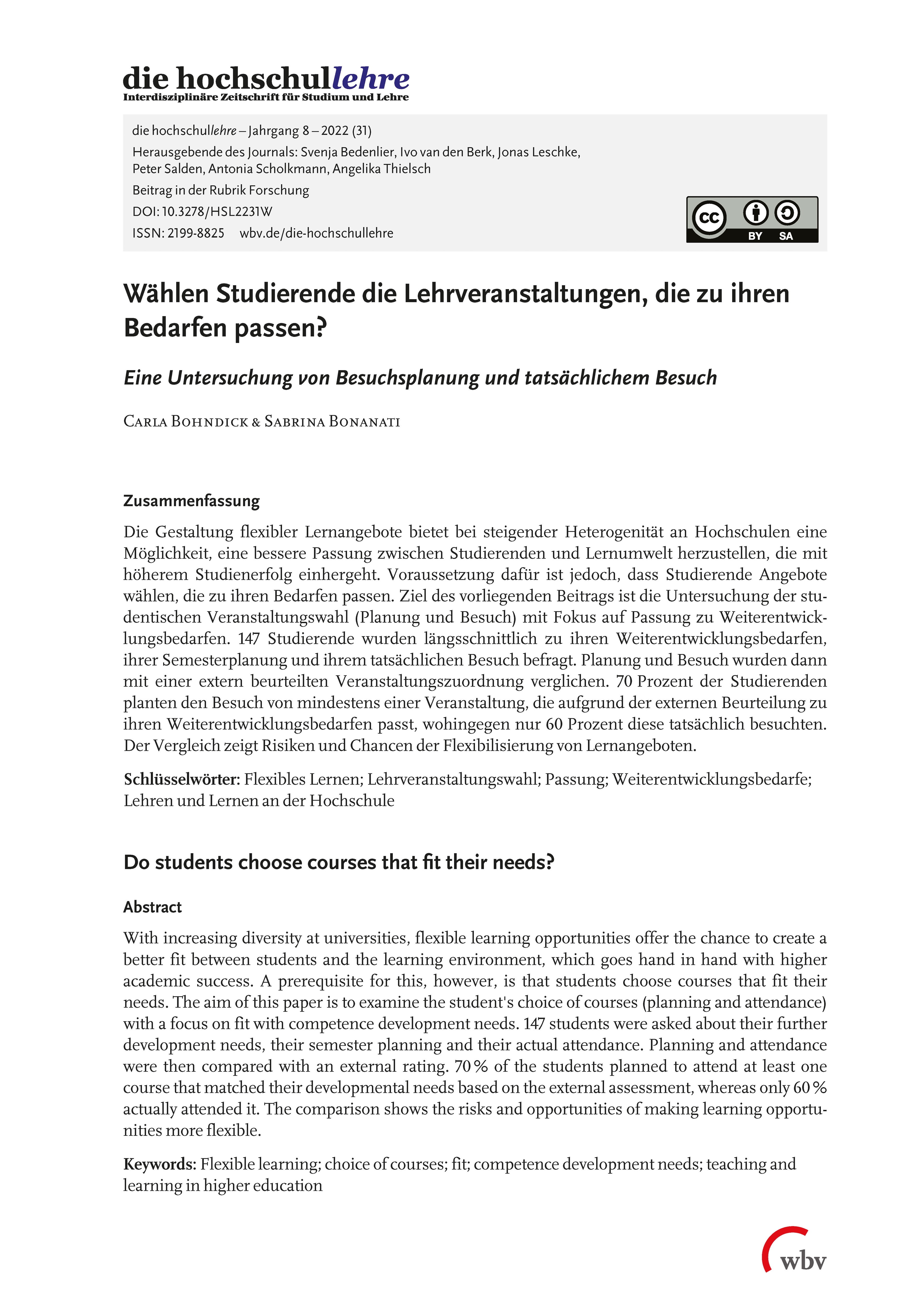 Bohndick, C. & Bonanati, S. (2022). Wählen Studierende die Lehrveranstaltungen, die zu ihren Bedarfen passen? Eine Untersuchung von Besuchsplanung und tatsächlichem Besuch. die hochschullehre, Jahrgang 8/2022. Bielefeld: wbv Publikation. DOI: 10.3278/HSL2231W.