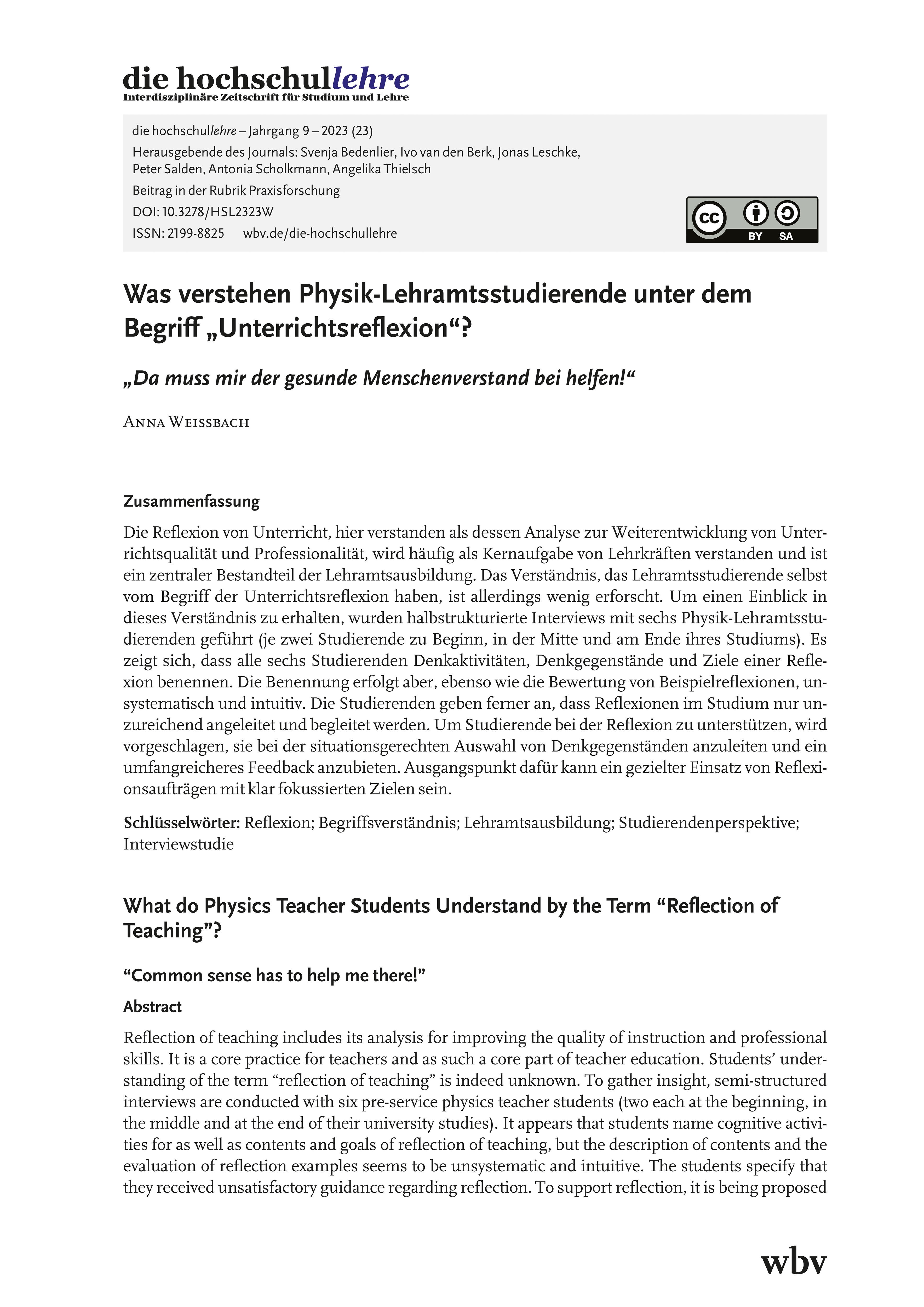Weißbach, A. (2023). Was verstehen Physik-Lehramtsstudierende unter dem Begriff „Unterrichtsreflexion"?. die hochschullehre, Jahrgang 9/2023. DOI: 10.3278/HSL2323W.
