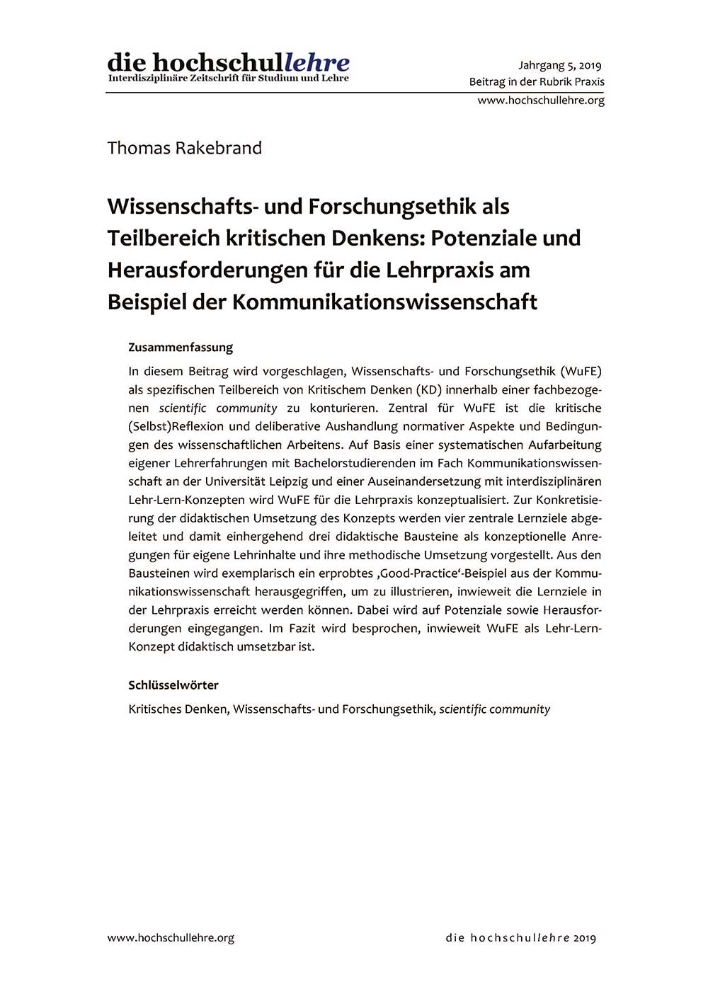 In diesem Beitrag wird vorgeschlagen, Wissenschafts- und Forschungsethik (WuFE) als spezifischen Teilbereich von Kritischem Denken (KD) innerhalb einer fachbezogenen scientific community zu konturieren. Zentral für WuFE ist die kritische (Selbst)Reflexion und deliberative Aushandlung normativer Aspekte und Bedingungen des wissenschaftlichen Arbeitens. Auf Basis einer systematischen Aufarbeitung eigener Lehrerfahrungen mit Bachelorstudierenden im Fach Kommunikationswissenschaft an der Universität Leipzig und einer Auseinandersetzung mit interdisziplinären Lehr-Lern-Konzepten wird WuFE für die Lehrpraxis konzeptualisiert. Zur Konkretisierung der didaktischen Umsetzung des Konzepts werden vier zentrale Lernziele abgeleitet und damit einhergehend drei didaktische Bausteine als konzeptionelle Anregungen für eigene Lehrinhalte und ihre methodische Umsetzung vorgestellt. Aus den Bausteinen wird exemplarisch ein erprobtes 'Good-Practice'-Beispiel aus der Kommunikationswissenschaft herausgegriffen, um zu illustrieren, inwieweit die Lernziele in der Lehrpraxis erreicht werden können. Dabei wird auf Potenziale sowie Herausforderungen eingegangen. Im Fazit wird besprochen, inwieweit WuFE als Lehr-Lern-Konzept didaktisch umsetzbar ist.