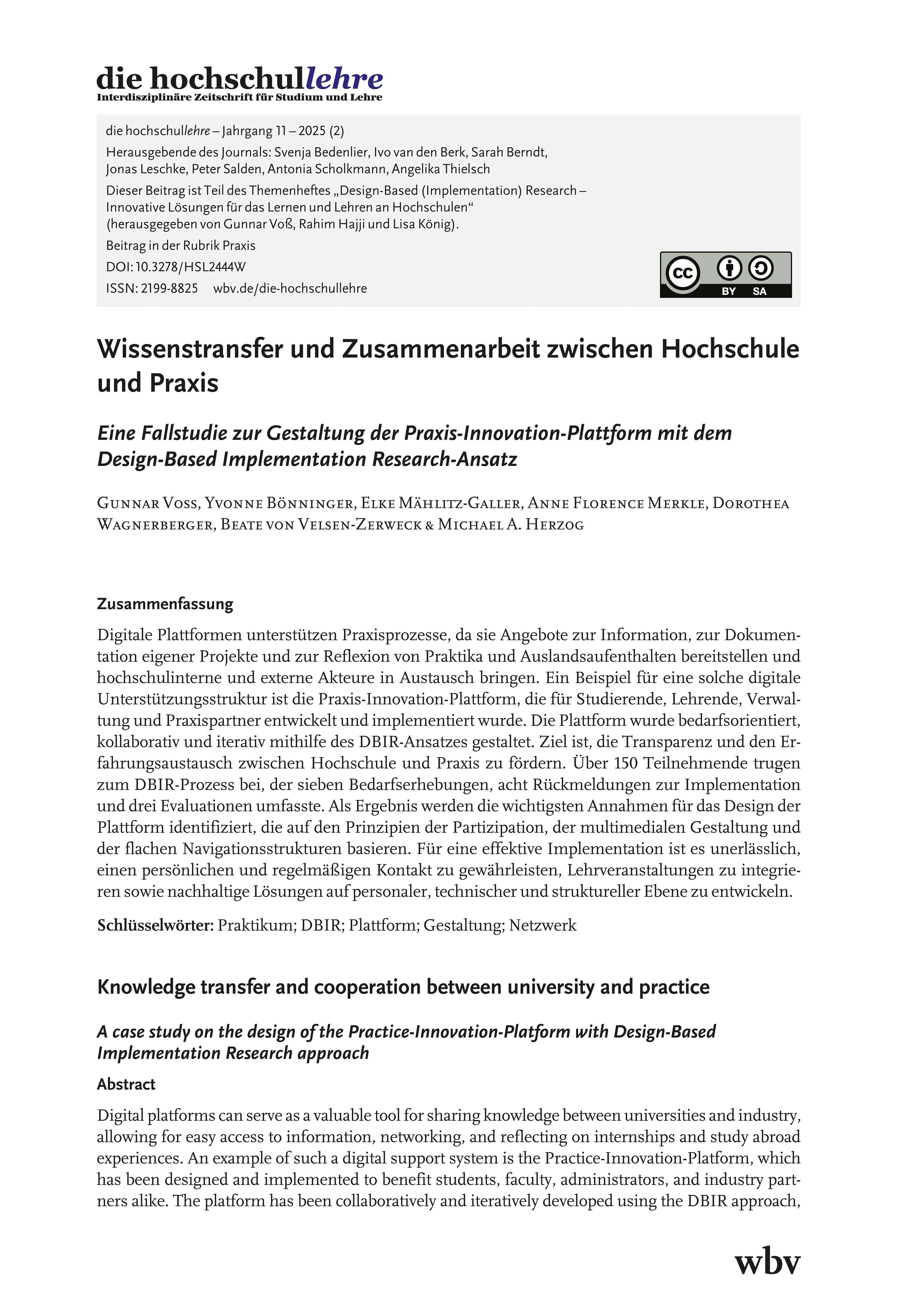 Voß, G., Bönninger, Y., Mählitz-Galler, E., Merkle, A. F., Wagnerberger, D., von Velsen-Zerweck, B. & Herzog, M. A. (2025). Wissenstransfer und Zusammenarbeit zwischen Hochschule und Praxis. die hochschullehre, Jahrgang 11/2025. DOI: 10.3278/HSL2444W.