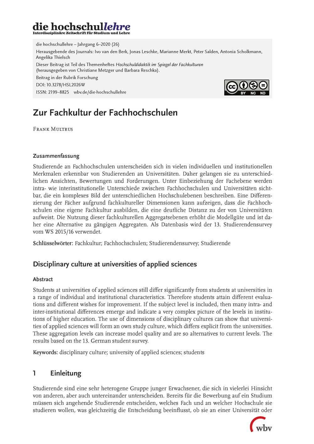 Multrus, F. (2020). Zur Fachkultur der Fachhochschulen. die hochschullehre. Jahrgang 6/2020. DOI: 10.3278/HSL2026W.