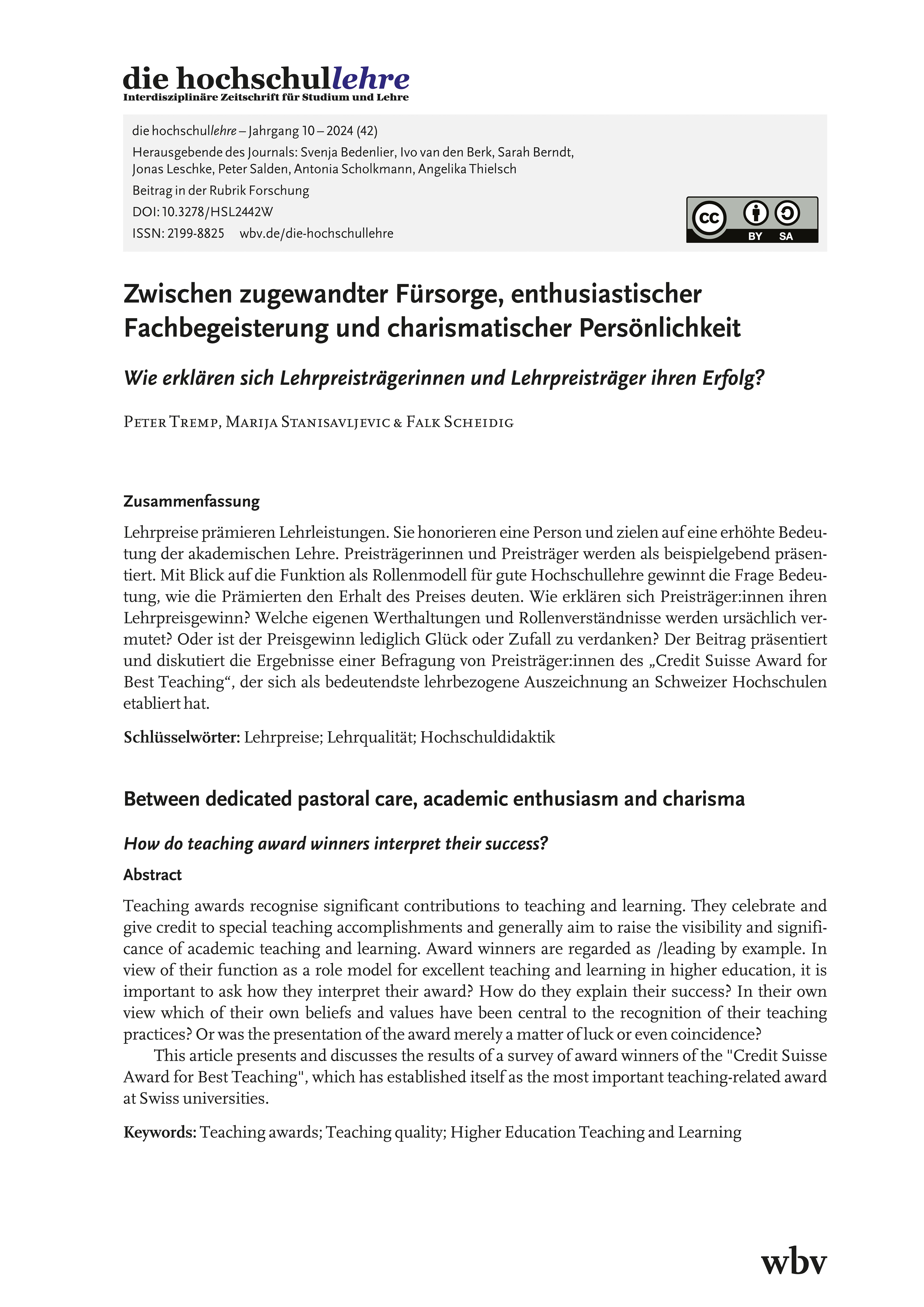 Tremp, P., Stanisavljević, M. & Scheidig, F. (2024). Zwischen zugewandter Fürsorge, enthusiastischer Fachbegeisterung und charismatischer Persönlichkeit - Wie erklären sich Lehrpreisträgerinnen und Lehrpreisträger ihren Erfolg?. die hochschullehre, Jahrgang 10/2024. DOI: 10.3278/HSL2442W.