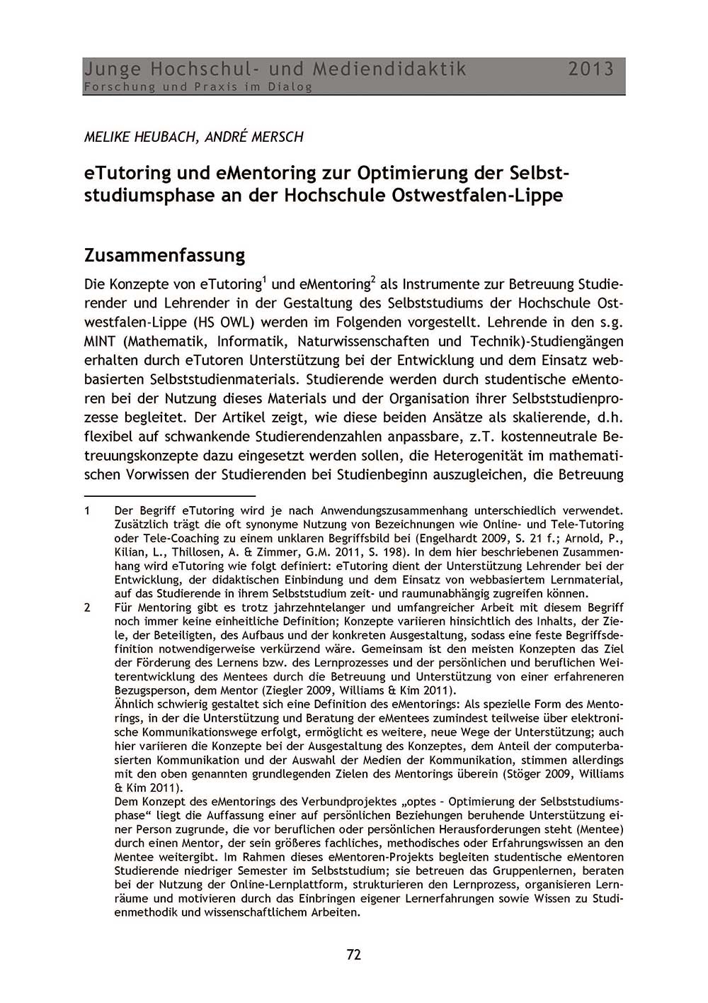 Die Konzepte von eTutoring und eMentoring als Instrumente zur Betreuung Studierender und Lehrender in der Gestaltung des Selbststudiums der Hochschule Ostwestfalen-Lippe (HS OWL) werden im Folgenden vorgestellt. Lehrende in den s.g. MINT (Mathematik, Informatik, Naturwissenschaften und Technik)-Studiengängen erhalten durch eTutoren Unterstu¿tzung bei der Entwicklung und dem Einsatz webbasierten Selbststudienmaterials. Studierende werden durch studentische eMentoren bei der Nutzung dieses Materials und der Organisation ihrer Selbststudienprozesse begleitet. Der Artikel zeigt, wie diese beiden Ansätze als skalierende, d.h. flexibel auf schwankende Studierendenzahlen anpassbare, z.T. kostenneutrale Betreuungskonzepte dazu eingesetzt werden sollen, die Heterogenität im mathematischen Vorwissen der Studierenden bei Studienbeginn auszugleichen, die Betreuung im Selbststudium zu verbessern und damit die Abbruchquoten in den MINT-Fächern zu reduzieren.